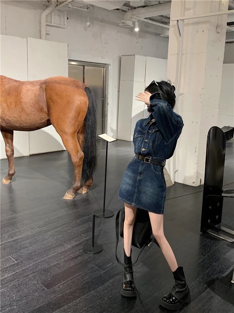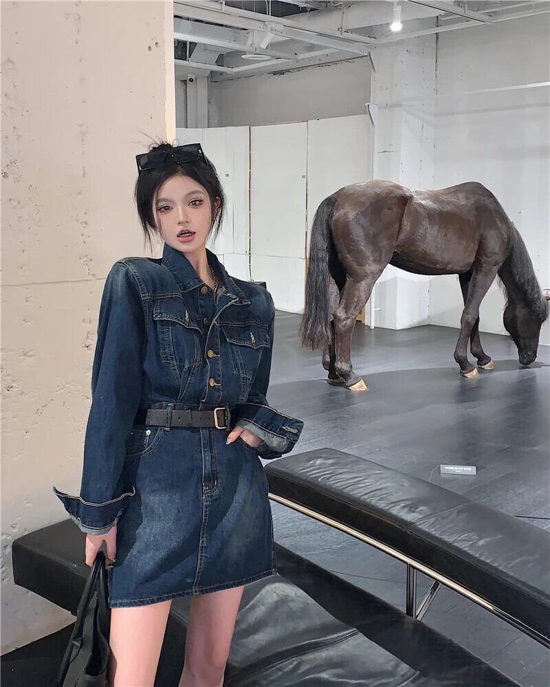 香港スタイルレトロ長袖デニムドレス春スリムフィットヒップラップ A ラインショートドレス ロング スプリング 春物 Aライン