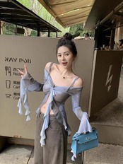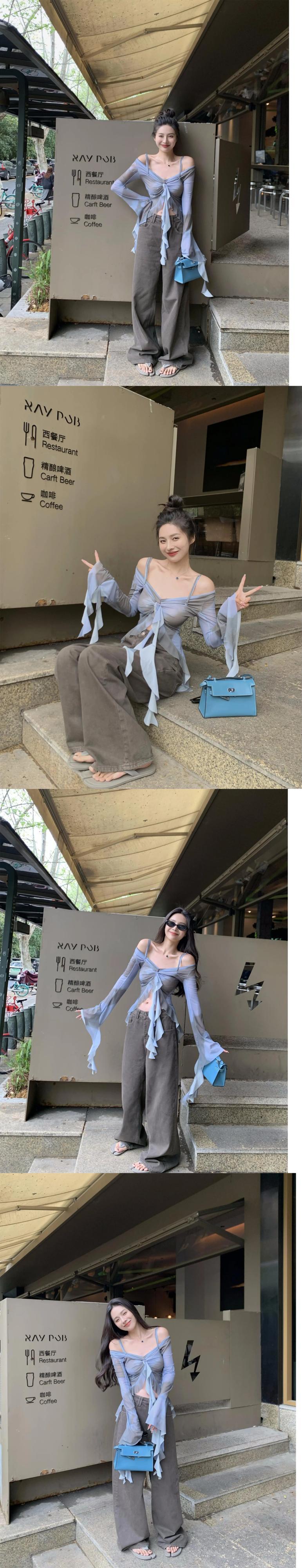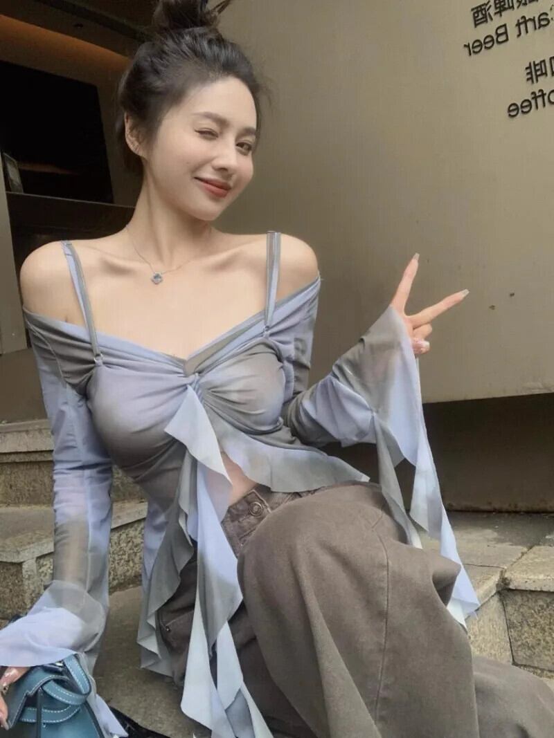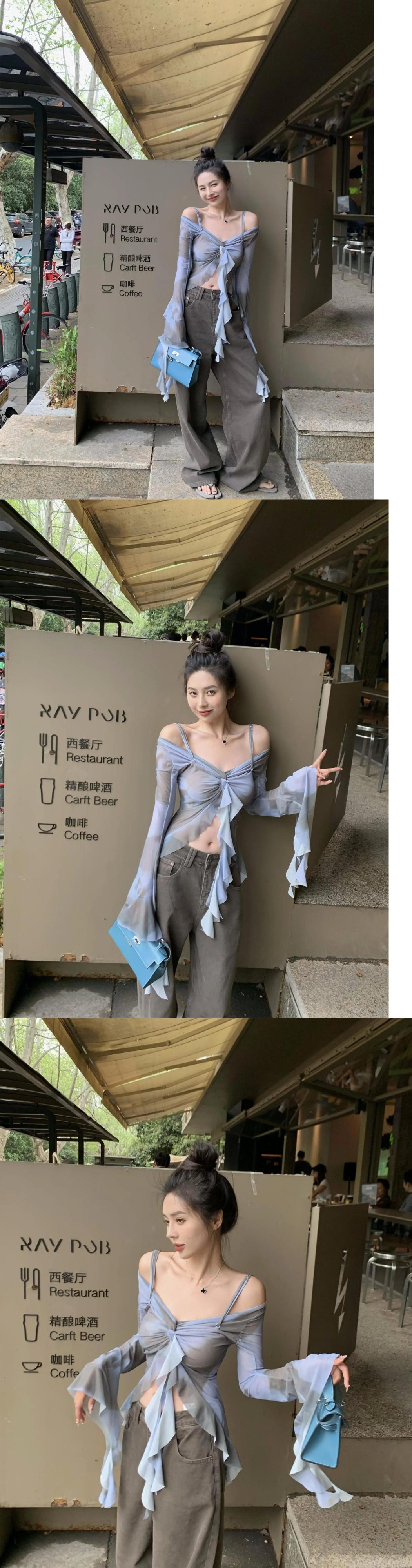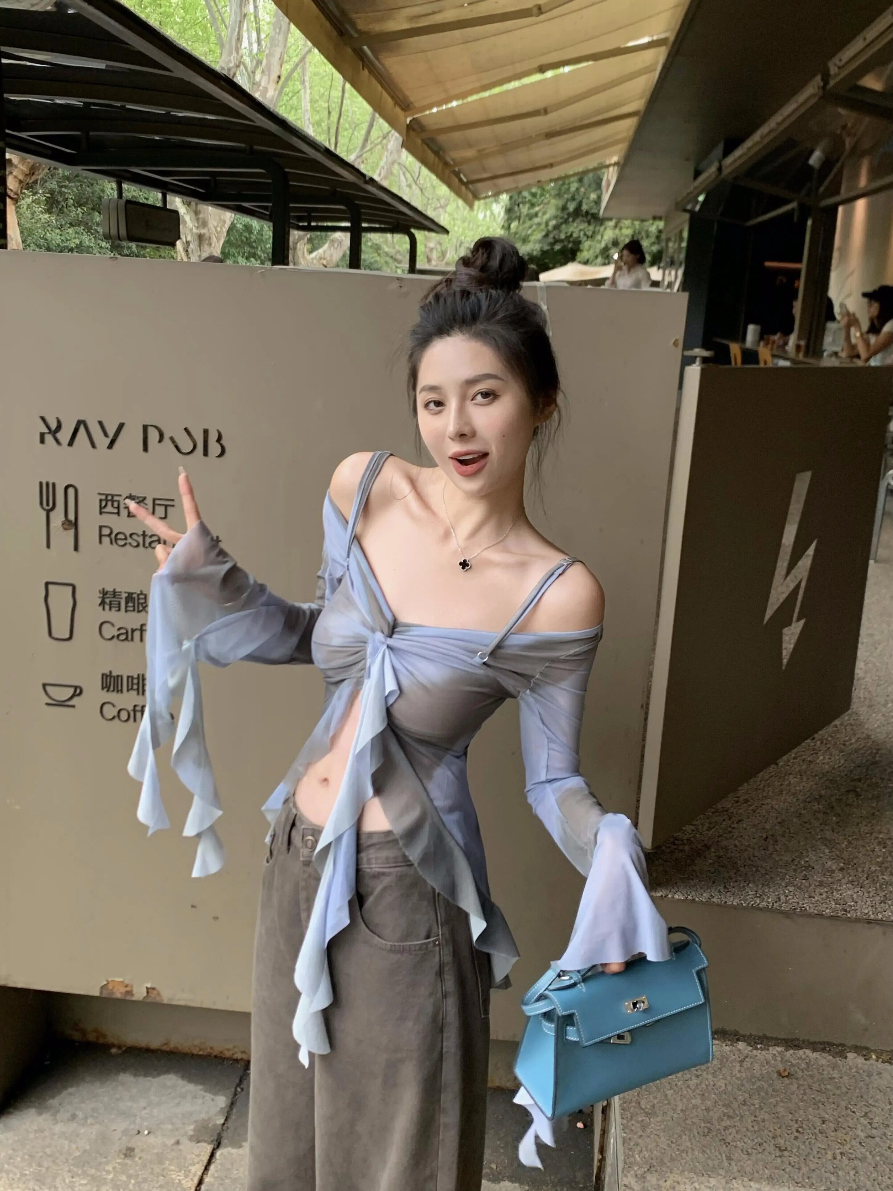 甘いホットガールフリルリボンシャツ春と夏純粋セクシータイダイスリムフィットオフショルダートップ 大人ガーリー スウィート キュート カジュアル スプリング 春物 サマー 夏物 ピュア
