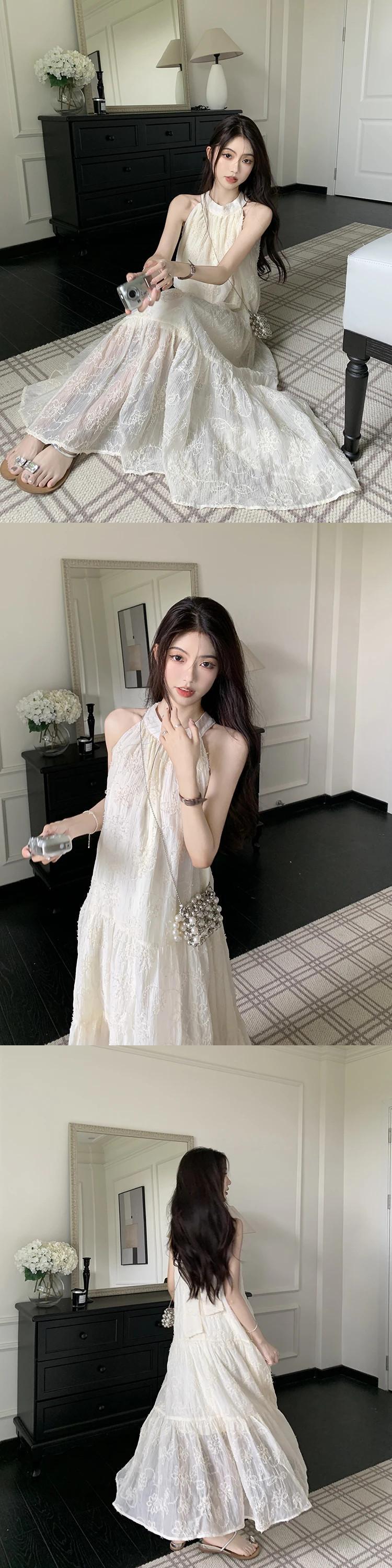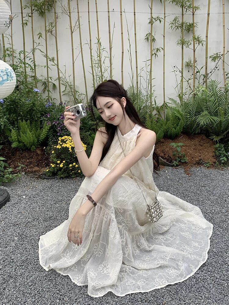 フレンチスイートホットガール妖精ホルターネックドレス春レースアップルーズ休暇Aラインロングドレス 大人ガーリー スウィート キュート カジュアル スプリング 春物