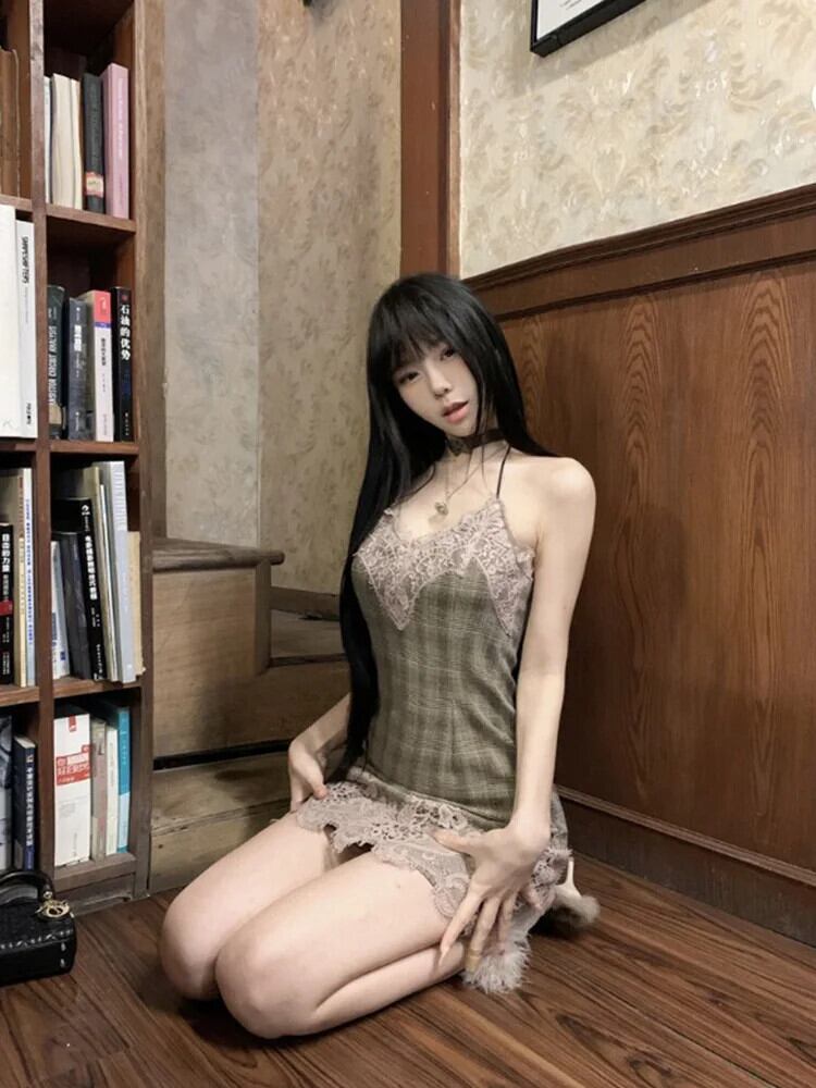 純粋セクシーチェック柄レースコントラストホルターネックドレス早春スリムフィットウエストラップヒップショートドレス スプリング 春物