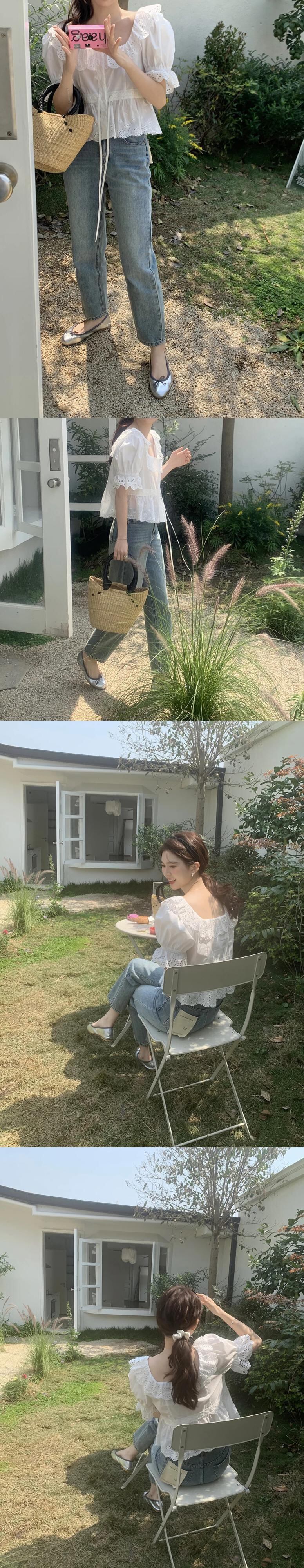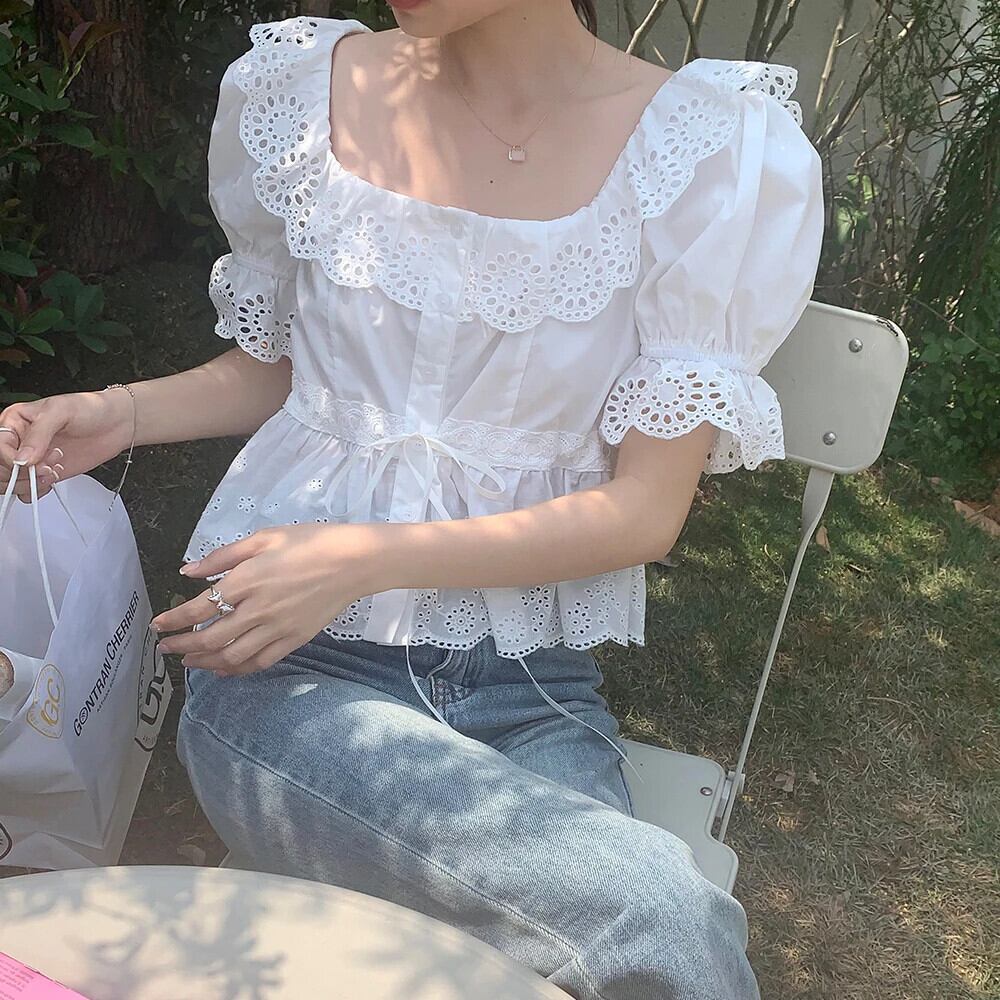 甘いホットガールレースパッチワークピーターパン襟シャツ春/夏バブルスリーブスリムフィットシャツ 大人ガーリー スウィート キュート カジュアル スプリング 春物 サマー 夏物