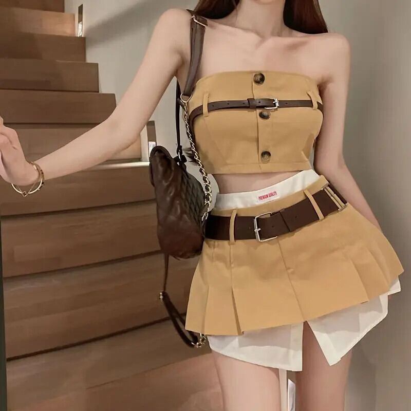 純粋セクシーアメリカンホットガールスーツ夏ストラップレスタンクトップ A ラインミニスカート 2 点セット サマー 夏物 Aライン