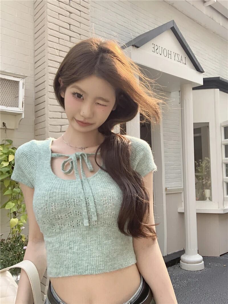 甘いホットガールレースアップ半袖ニット Tシャツ夏 O ネックスリムフィットショートトップ 大人ガーリー スウィート キュート カジュアル サマー 夏物 Oネック