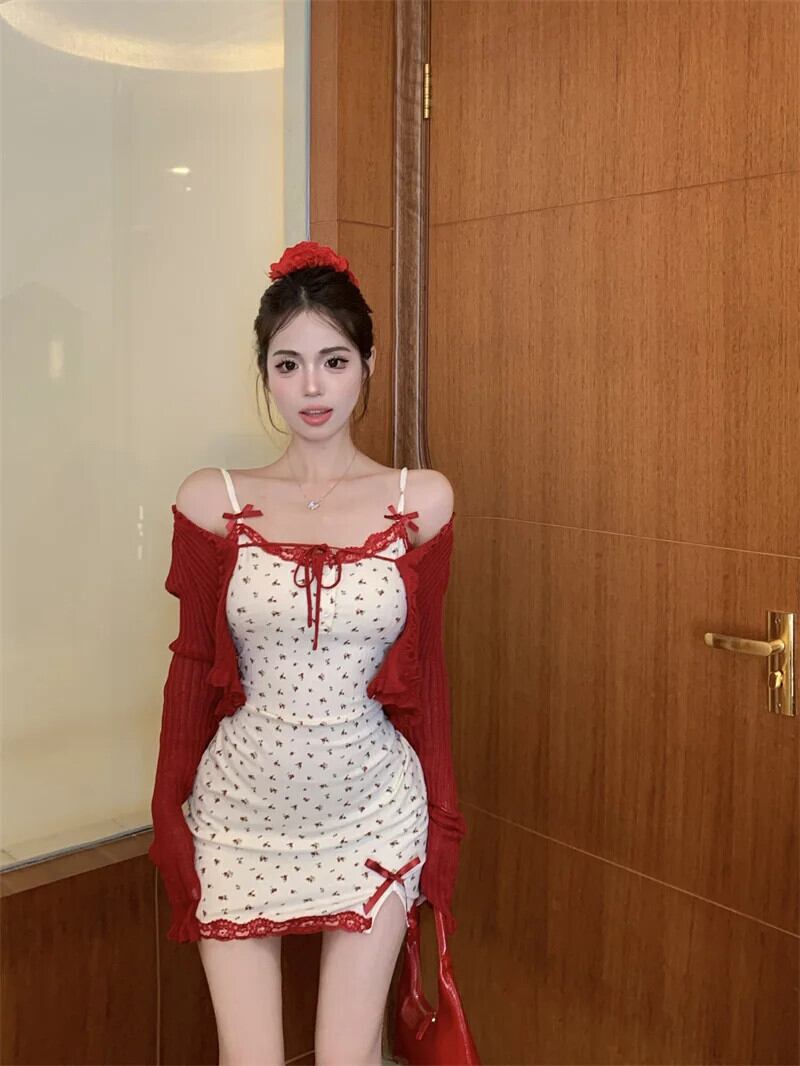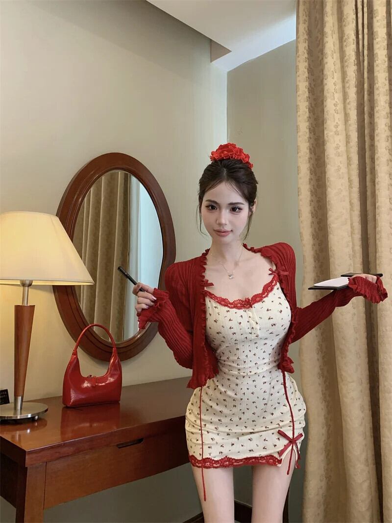スイートホットガールスーツ春/夏レッドレースアップコートストラップスリムフィット花柄ドレスツーピースセット 大人ガーリー スウィート キュート カジュアル スプリング 春物 サマー 夏物