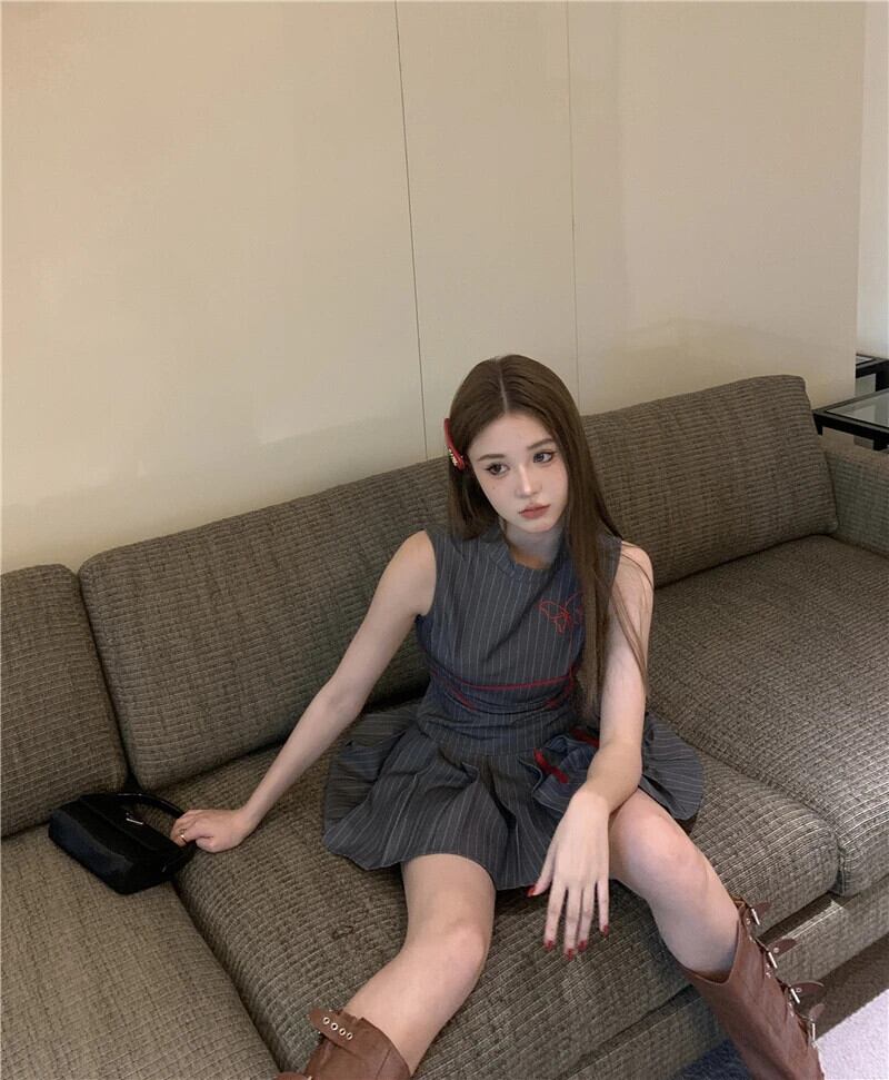 甘いホットガールスーツ夏刺繍ストライプスリムフィットタンクトップ A ラインプリーツミニスカート 2 点セット レッド 大人ガーリー スウィート キュート カジュアル サマー 夏物 Aライン