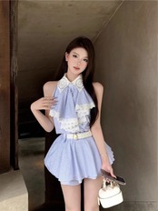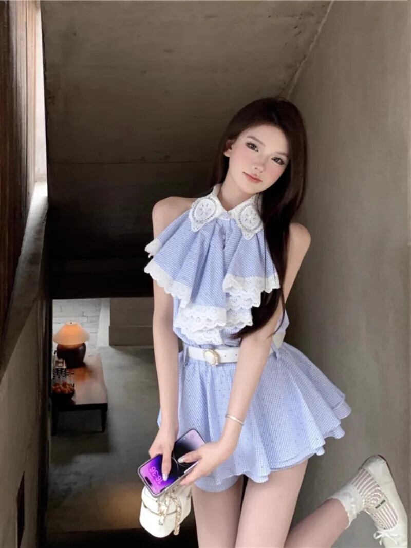 スイートホットガールブルースーツ春ホットダイヤモンドスリムフィットドレスウエストショーツツーピースセット 大人ガーリー スウィート キュート カジュアル スプリング 春物 ブルマー