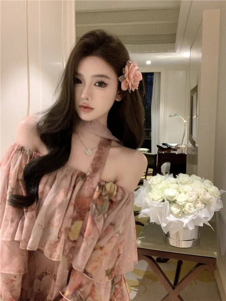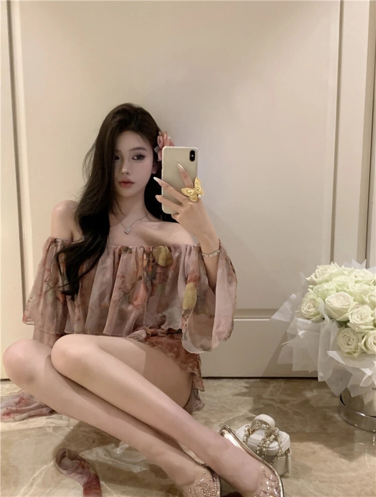 甘いホットガールスーツ春プリントオフショルダーシャツフリルエッジ A ラインミニスカート 2 点セット 大人ガーリー スウィート キュート カジュアル スプリング 春物 Aライン