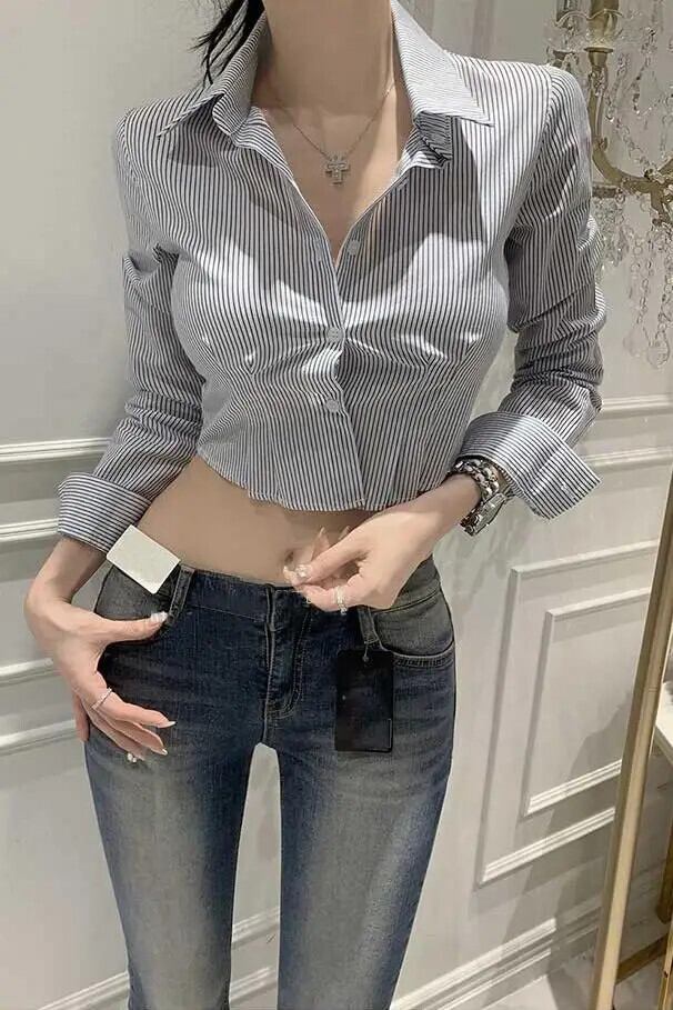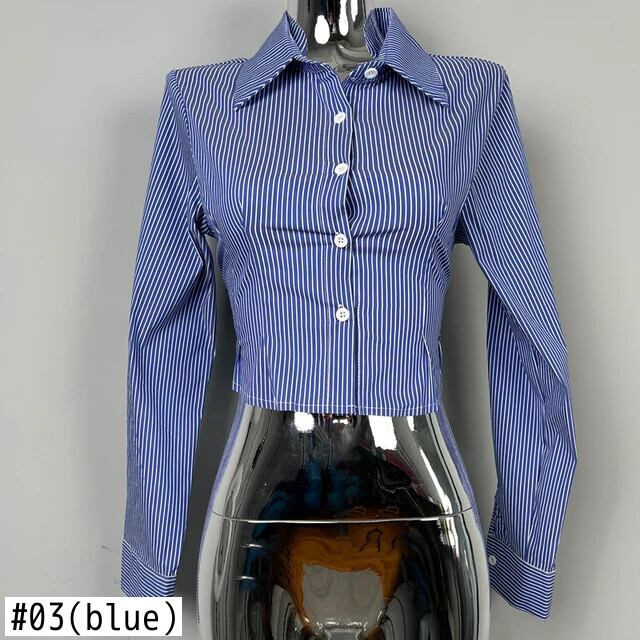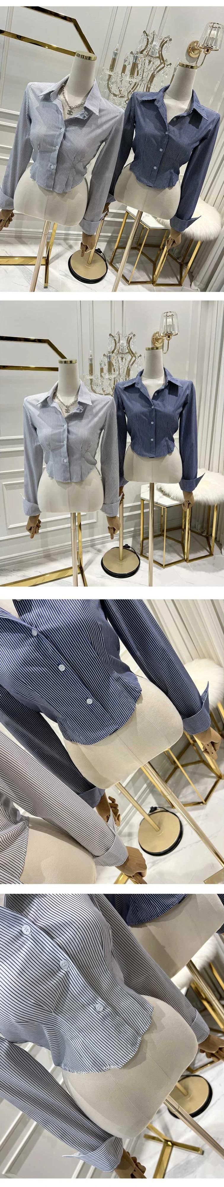 甘いホットガールターンダウンカラーショートストライプシャツ春/夏スリム長袖トップ ロング 大人ガーリー スウィート キュート カジュアル スプリング 春物 サマー 夏物