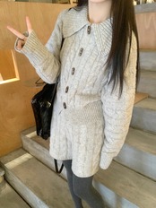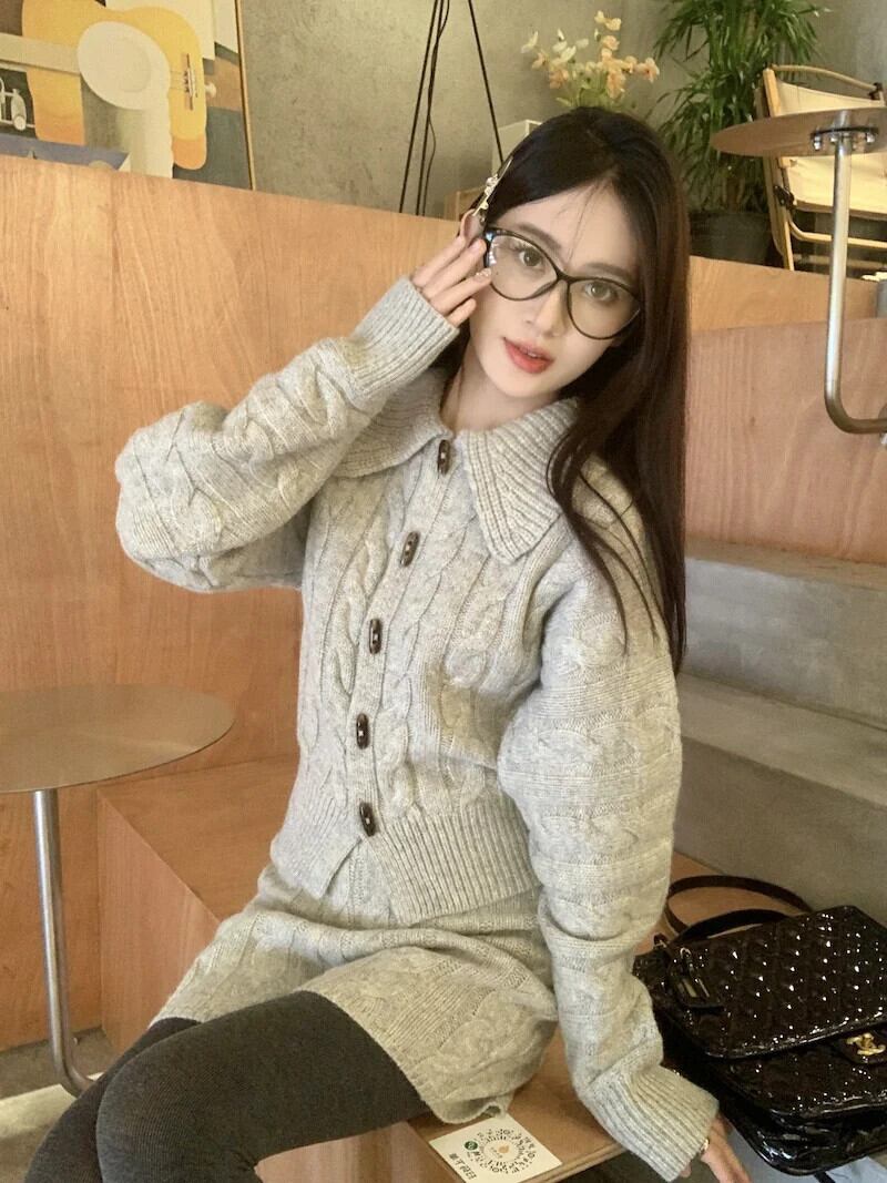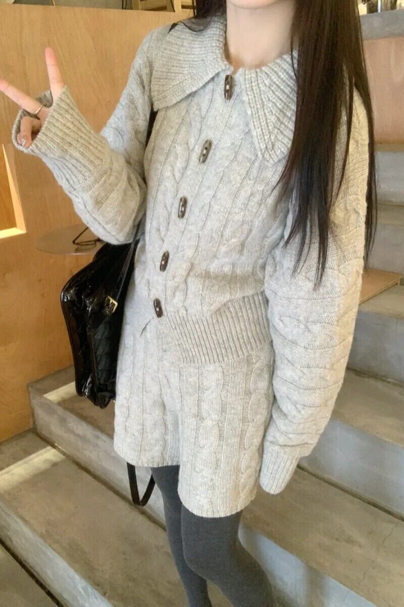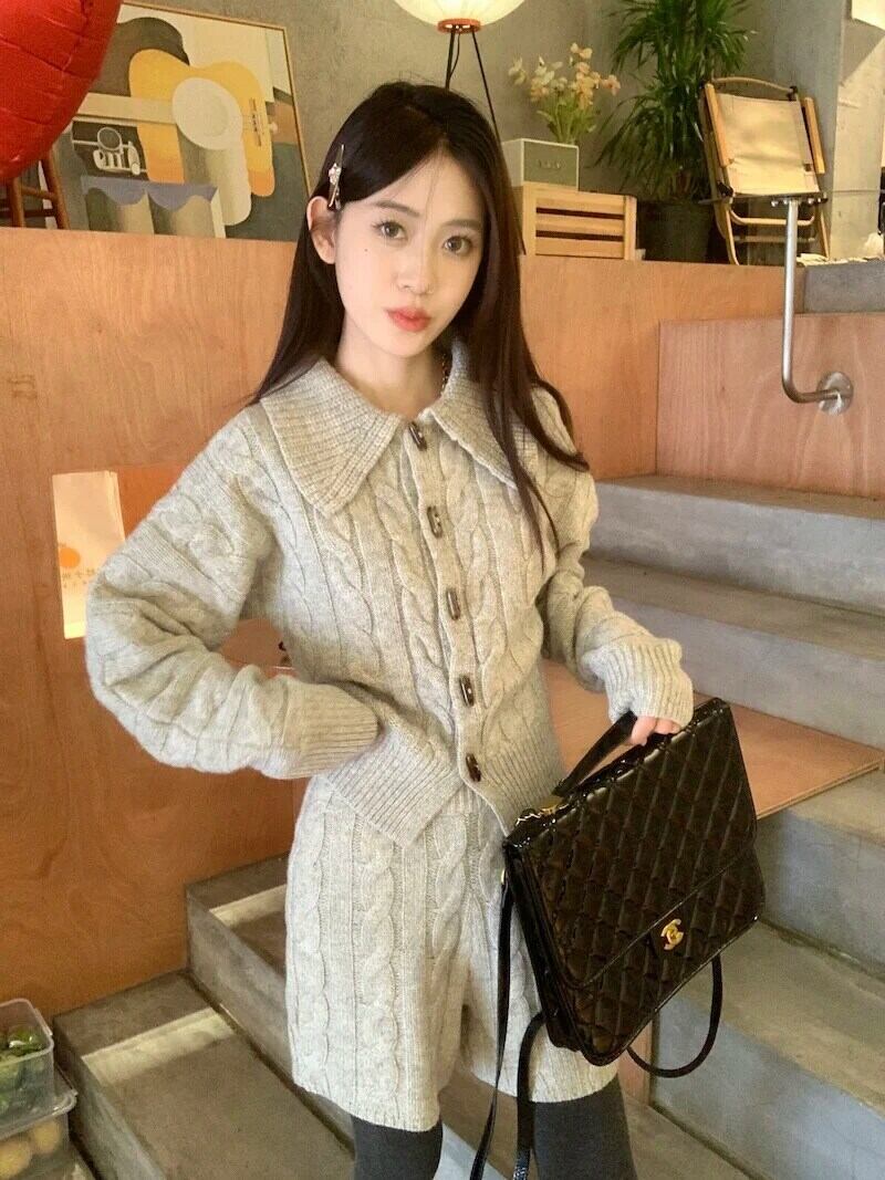 Sweet Hot Girl ニットスーツ レディース 秋冬 ホーンボタン ラペルツイスト セーター ニット ワイドレッグ ショーツ 2点セット 大人ガーリー スウィート キュート カジュアル オータム 秋物 ウィンター 冬物 ブルマー ワイドパンツ