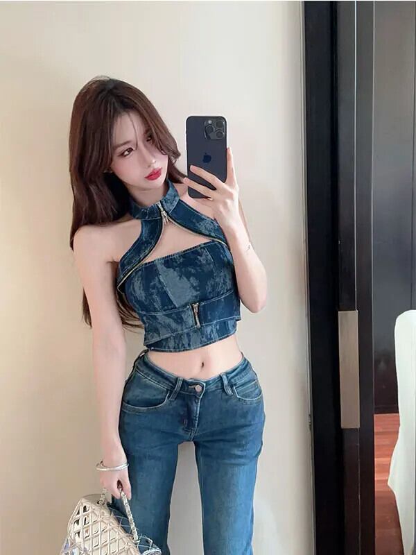 甘いホットガールデニムホルターネックストラップベスト春/夏純粋セクシージッパースリムフィットショートトップ 大人ガーリー スウィート キュート カジュアル スプリング 春物 サマー 夏物 ピュア