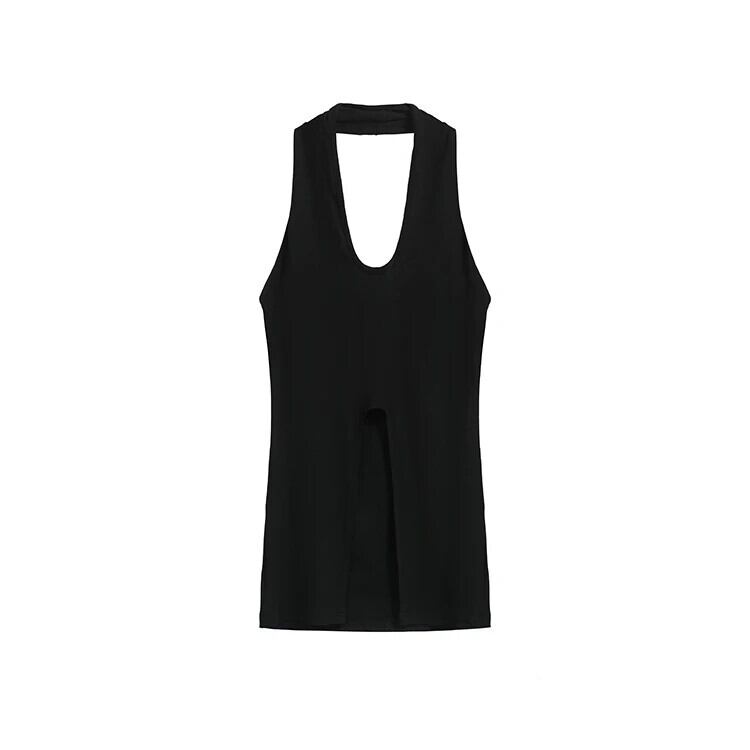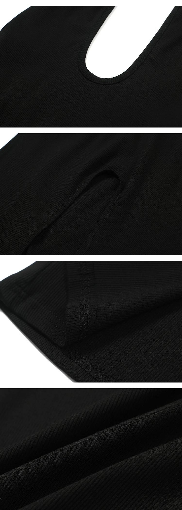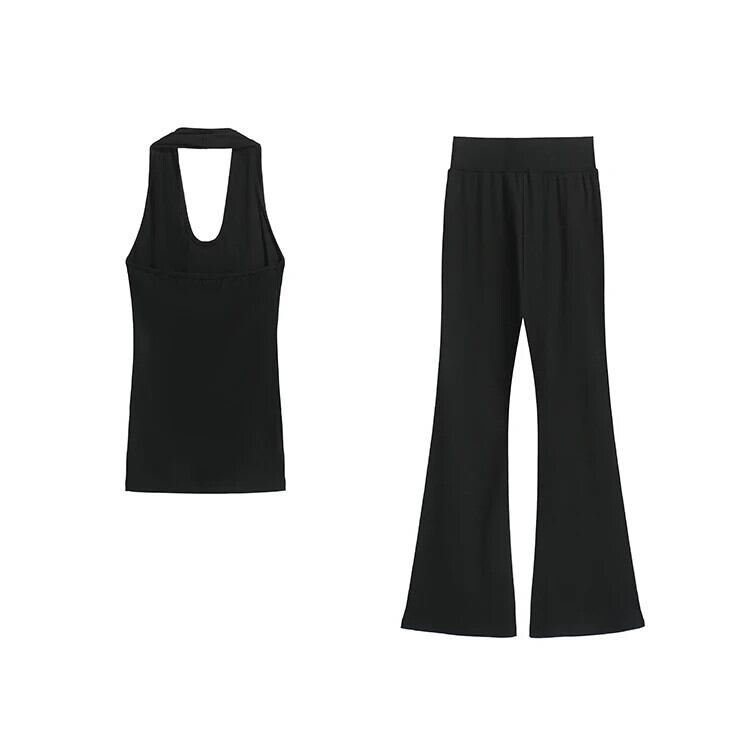 甘いホットガールスーツ夏黒弾性ニットホルターネックタンクトップフレアパンツツーピースセット ブラック エラスティック 伸縮 大人ガーリー スウィート キュート カジュアル サマー 夏物