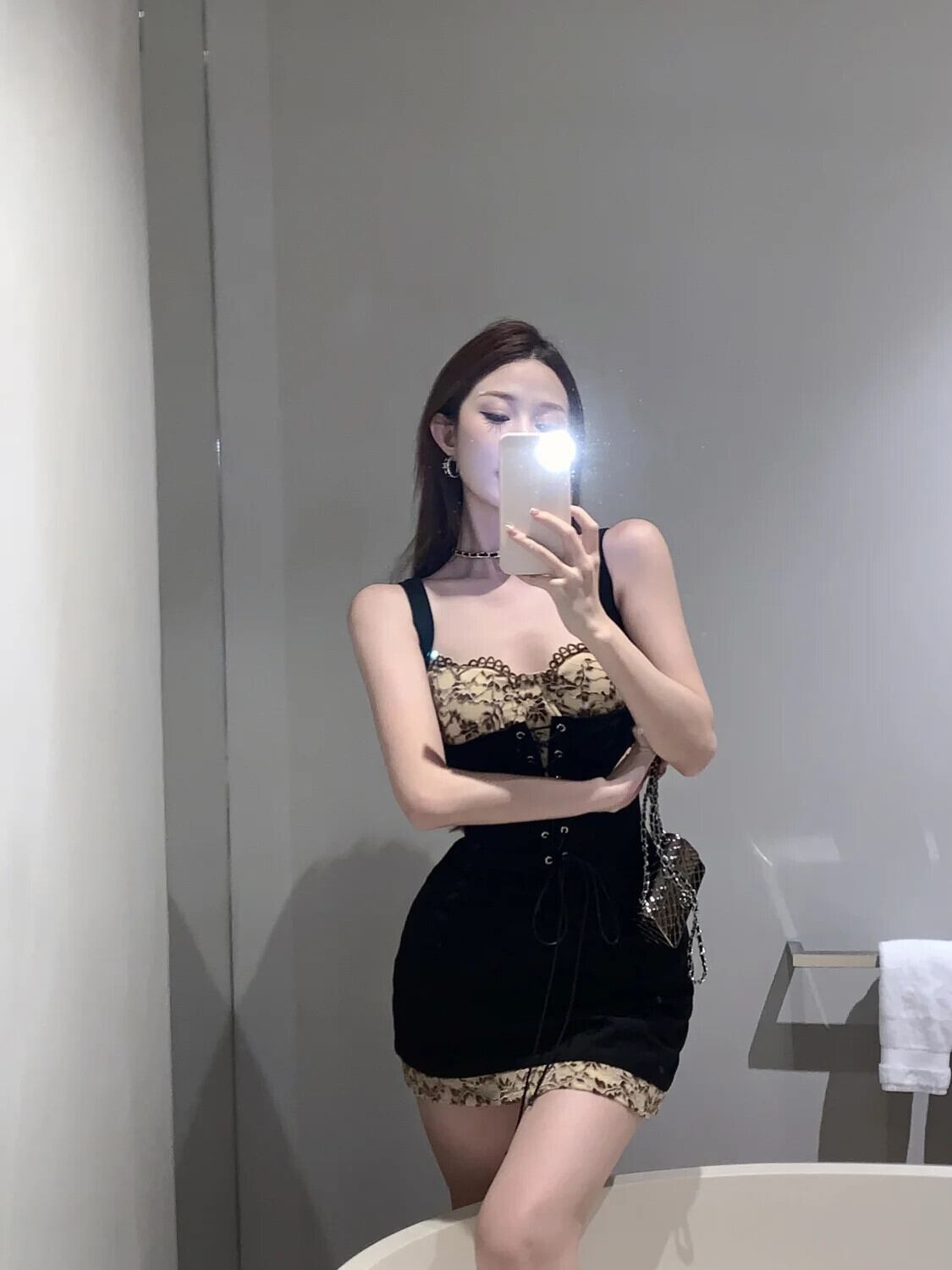 純粋セクシーホットガール偽ツーピースレースセクシーストラップドレス夏スリムフィットレースアップブラックスリムフィットラップ尻ショートドレス サマー 夏物