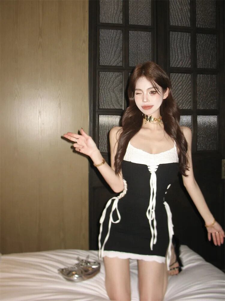 甘いホットガール偽ツーピースレースアップパッチワークドレス春セクシータイトフィット臀部ショートドレス 大人ガーリー スウィート キュート カジュアル スプリング 春物