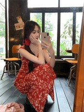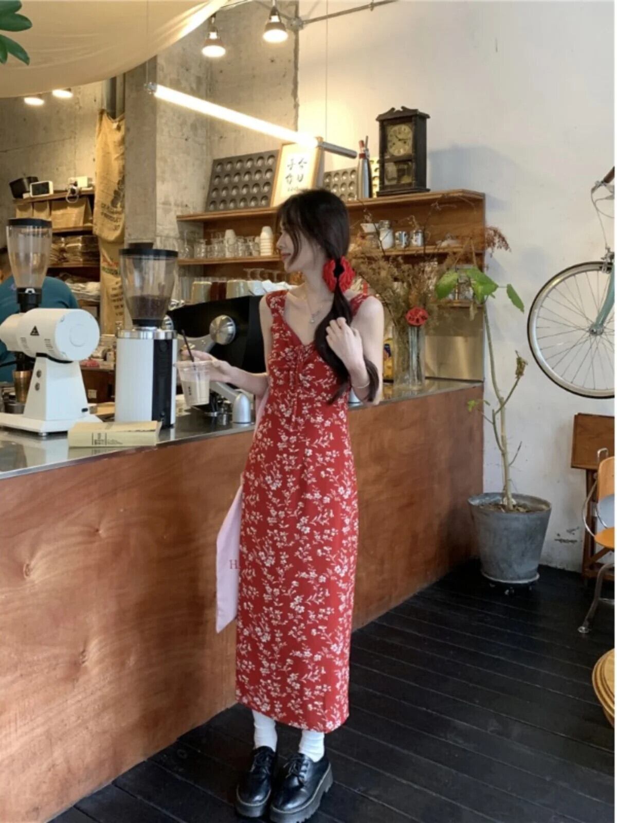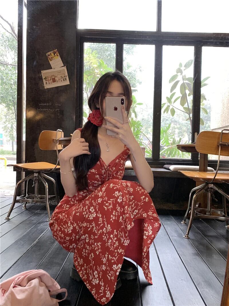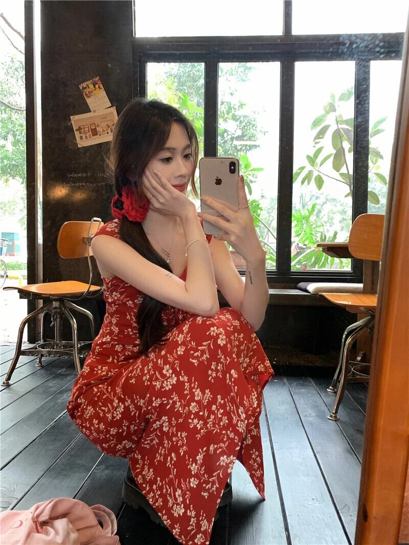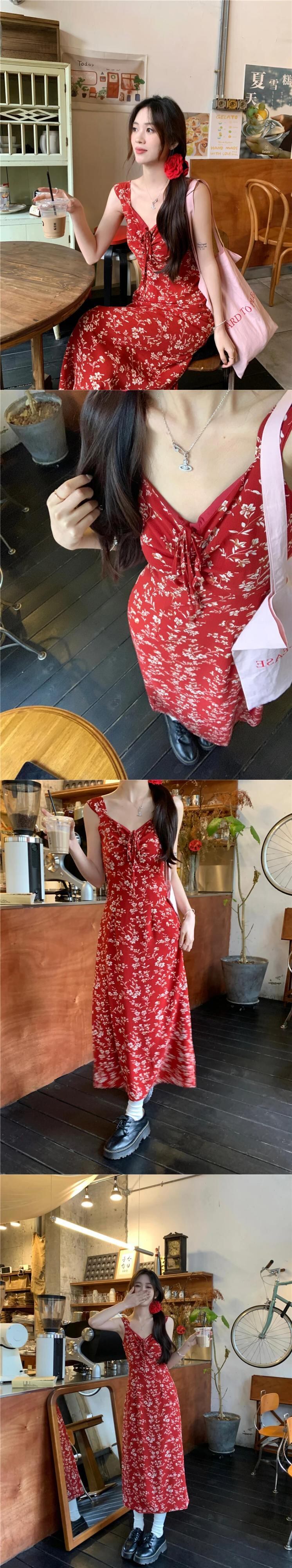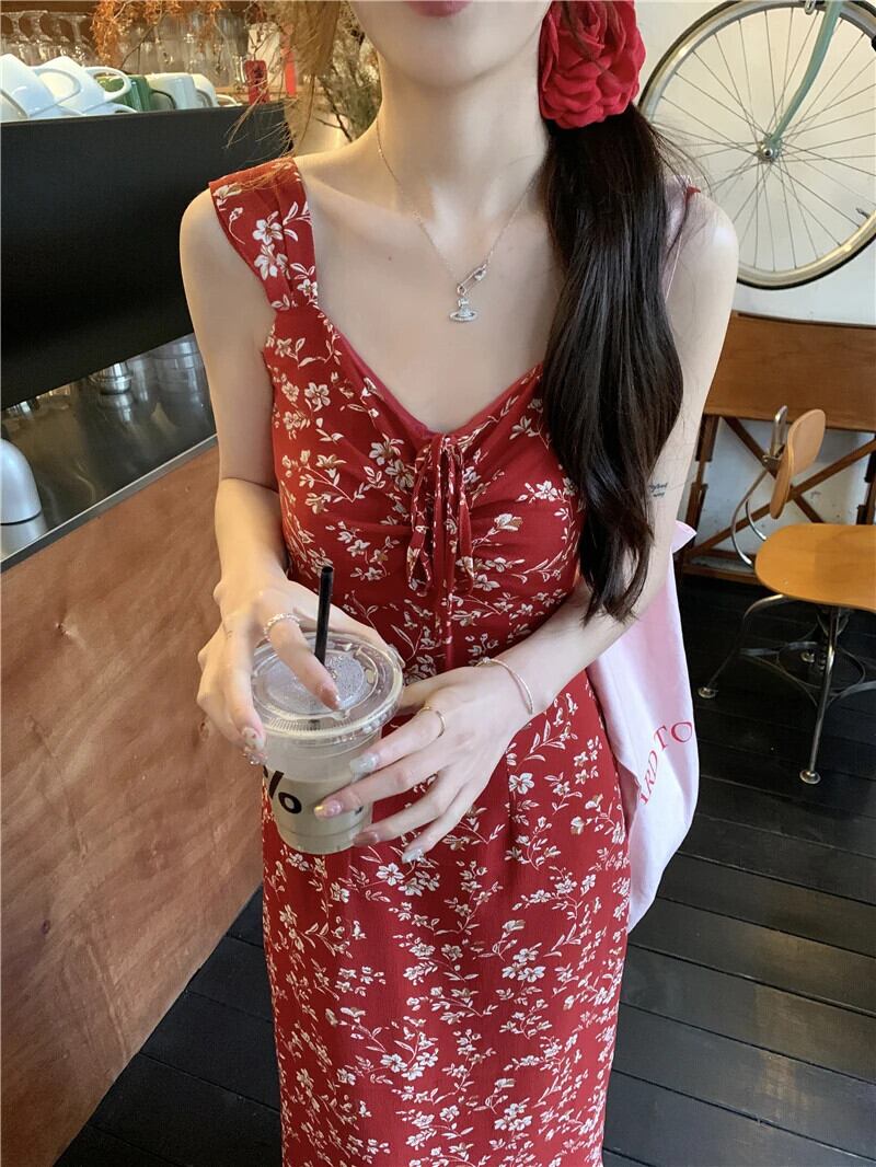 甘いホットガールレトロ赤花柄ストラップドレス夏 V ネックプリーツレースアップ休暇ロングドレス レッド 大人ガーリー スウィート キュート カジュアル サマー 夏物 Vネック