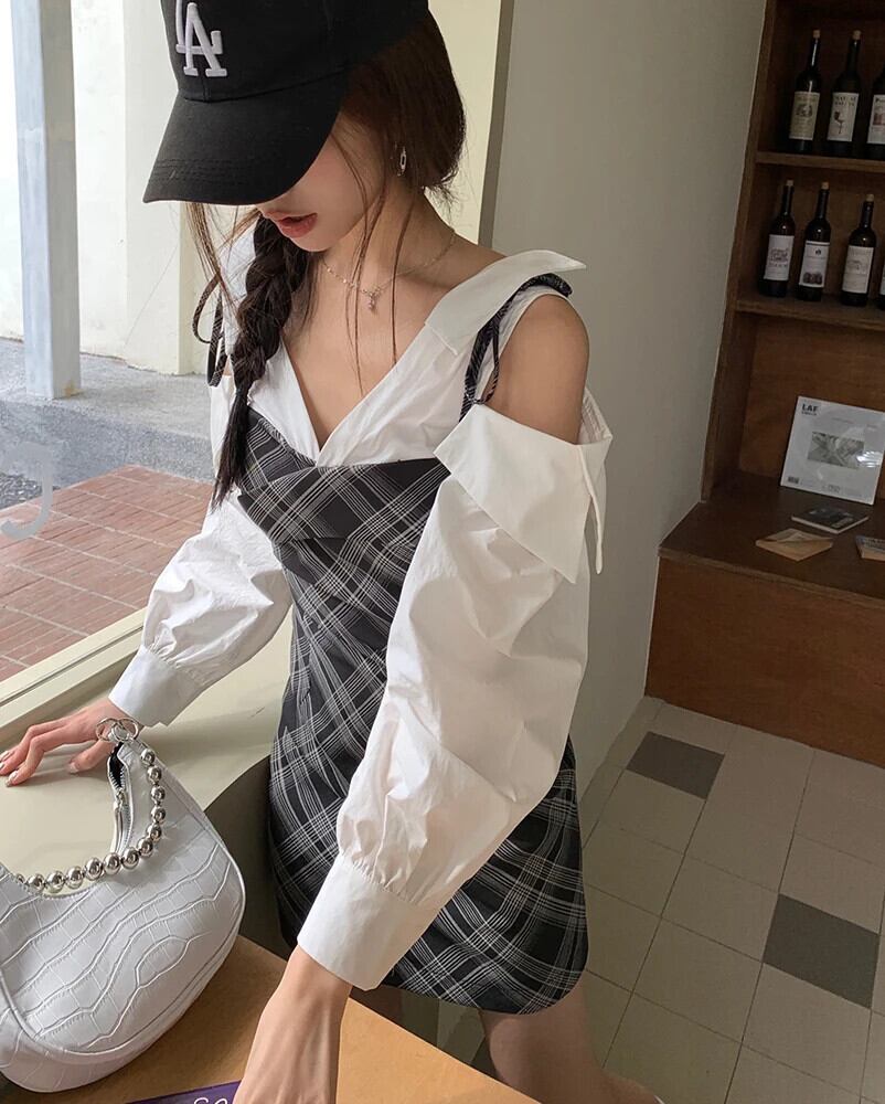 甘いホットガールフェイクツーピースチェック柄ドレス夏スリムフィットオフショルダーヒップラップショートドレス 大人ガーリー スウィート キュート カジュアル サマー 夏物
