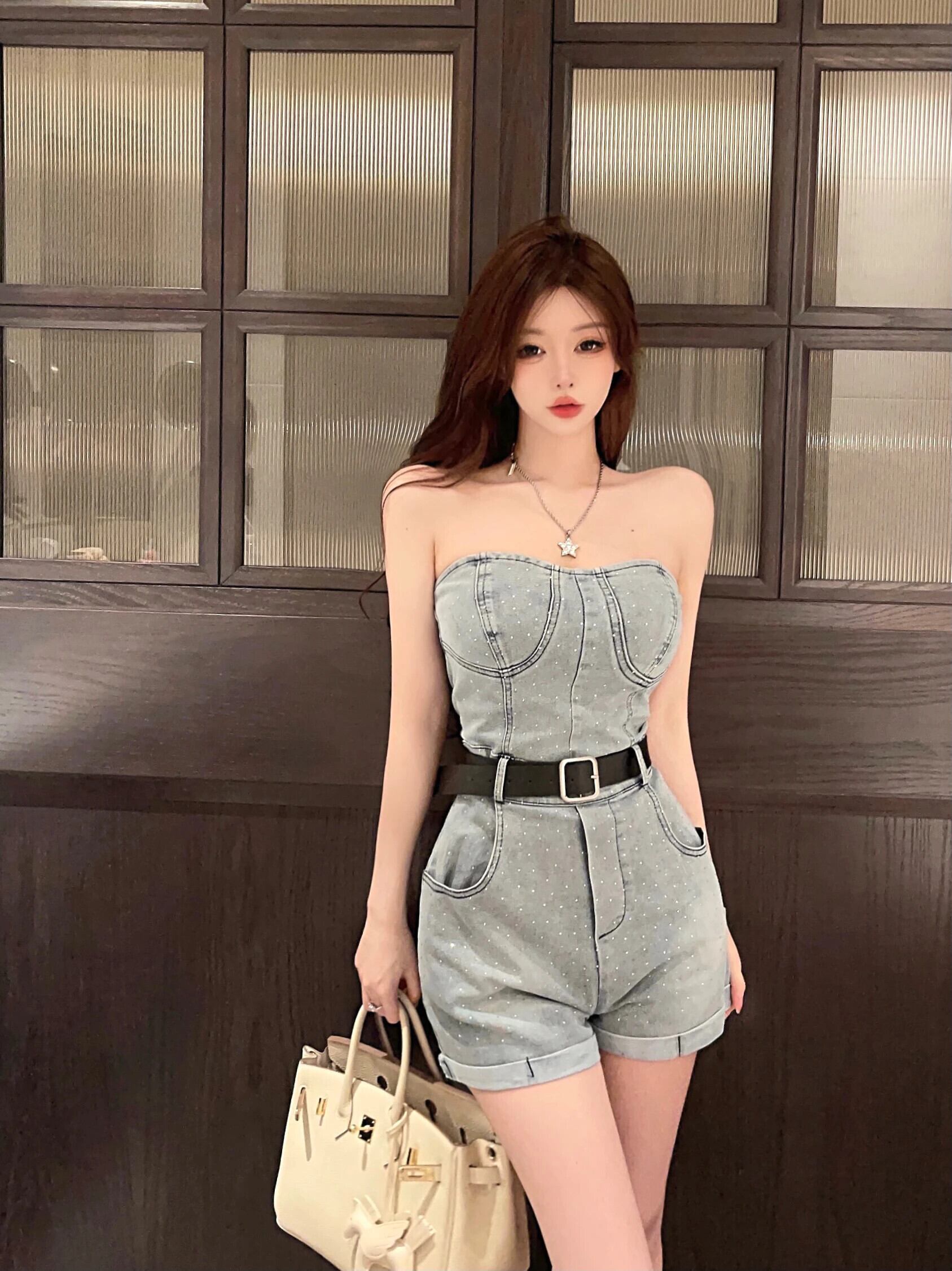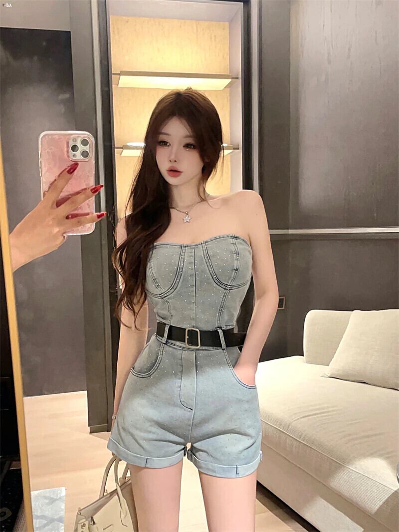 甘いホットガールスラッシュネックデニムベルト&ジャンプスーツ春/夏純粋セクシーストラップレススリムフィットロンパースショーツ 大人ガーリー スウィート キュート カジュアル スプリング 春物 サマー 夏物 ハーネス ブルマー ピュア