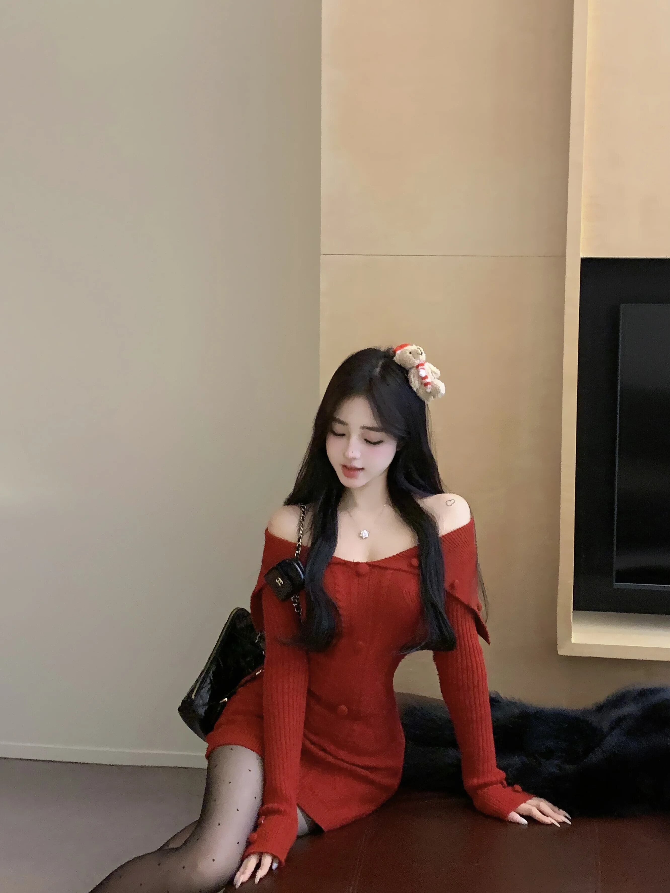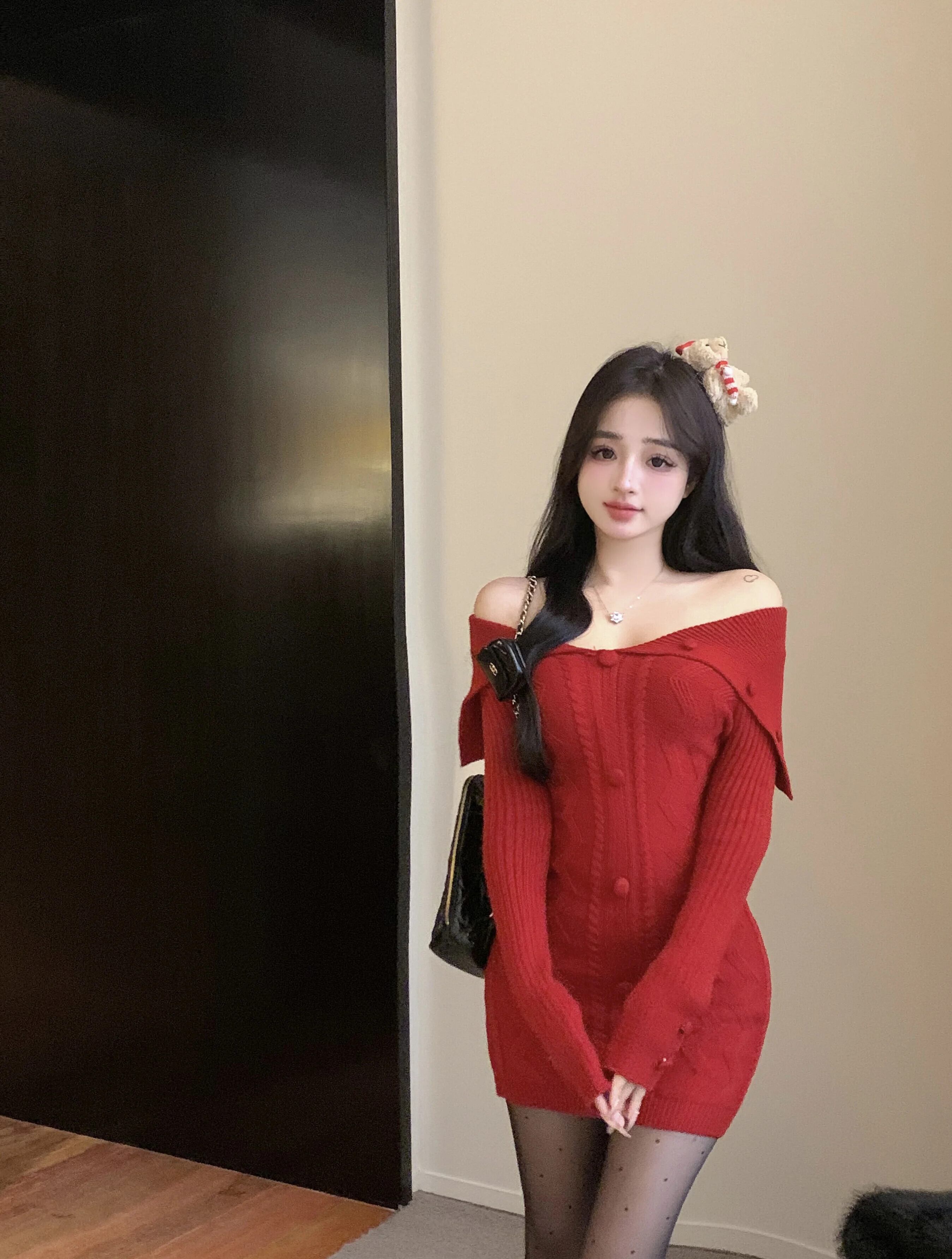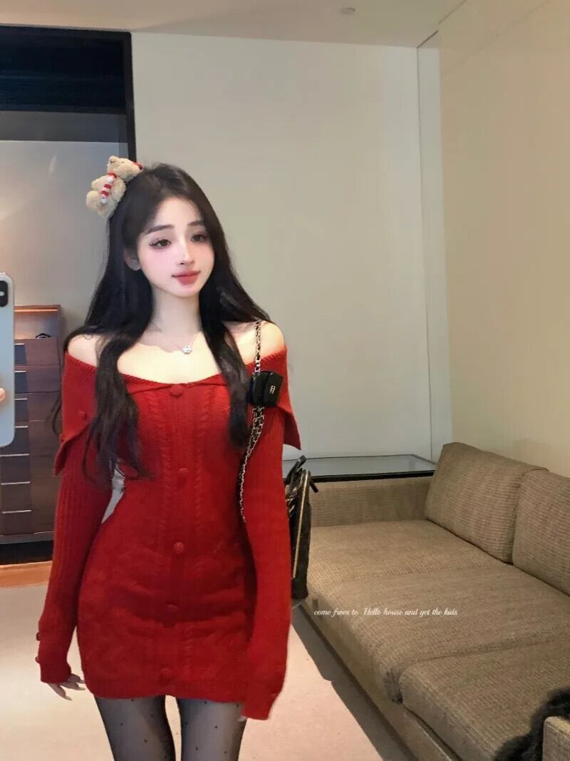 純粋セクシーホットガールオフショルダーレッドニットドレス春スリムフィットラップヒップボトムショートドレス スプリング 春物