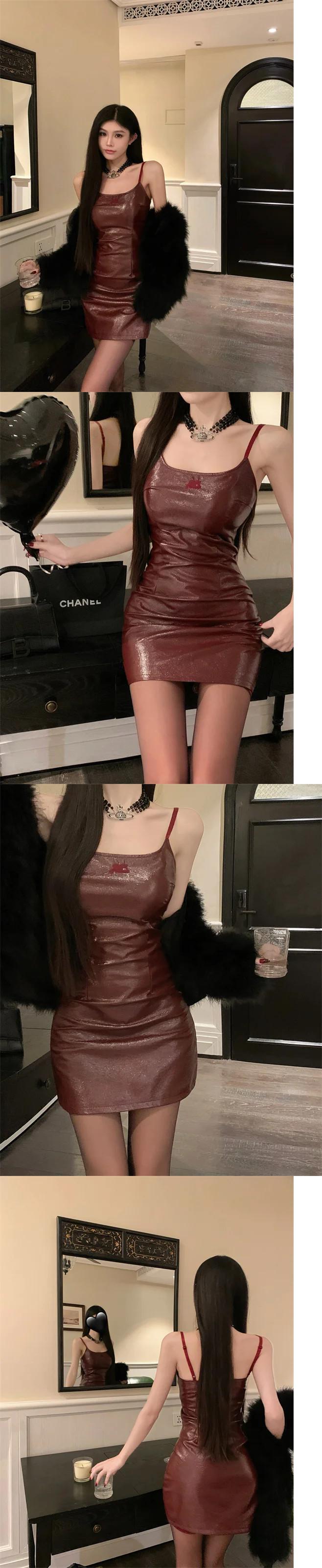 フレンチスウィートホットガール刺繍PUドレス春/夏ウエストAラインストラップドレス レッド 大人ガーリー キュート カジュアル スプリング 春物 サマー 夏物