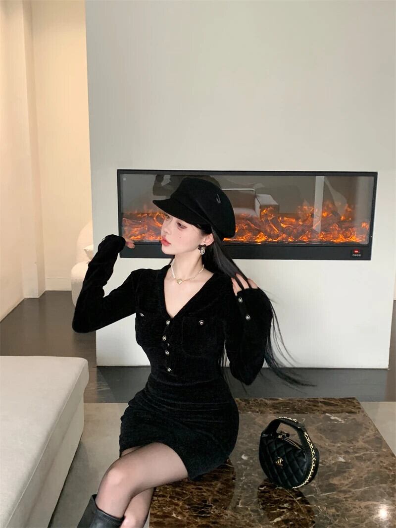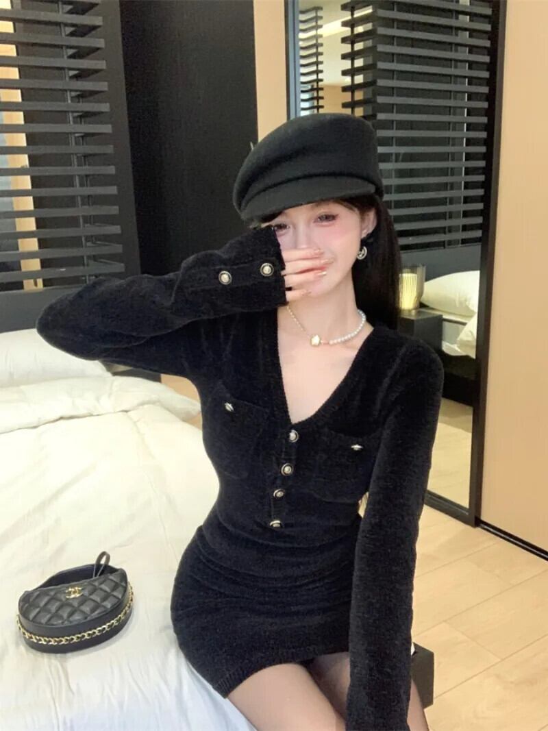 甘いホットガール純粋セクシーブラックメタルボタン V ネックドレス春スリムフィットラップヒップショートドレス 大人ガーリー スウィート キュート カジュアル スプリング 春物 Vネック ピュア
