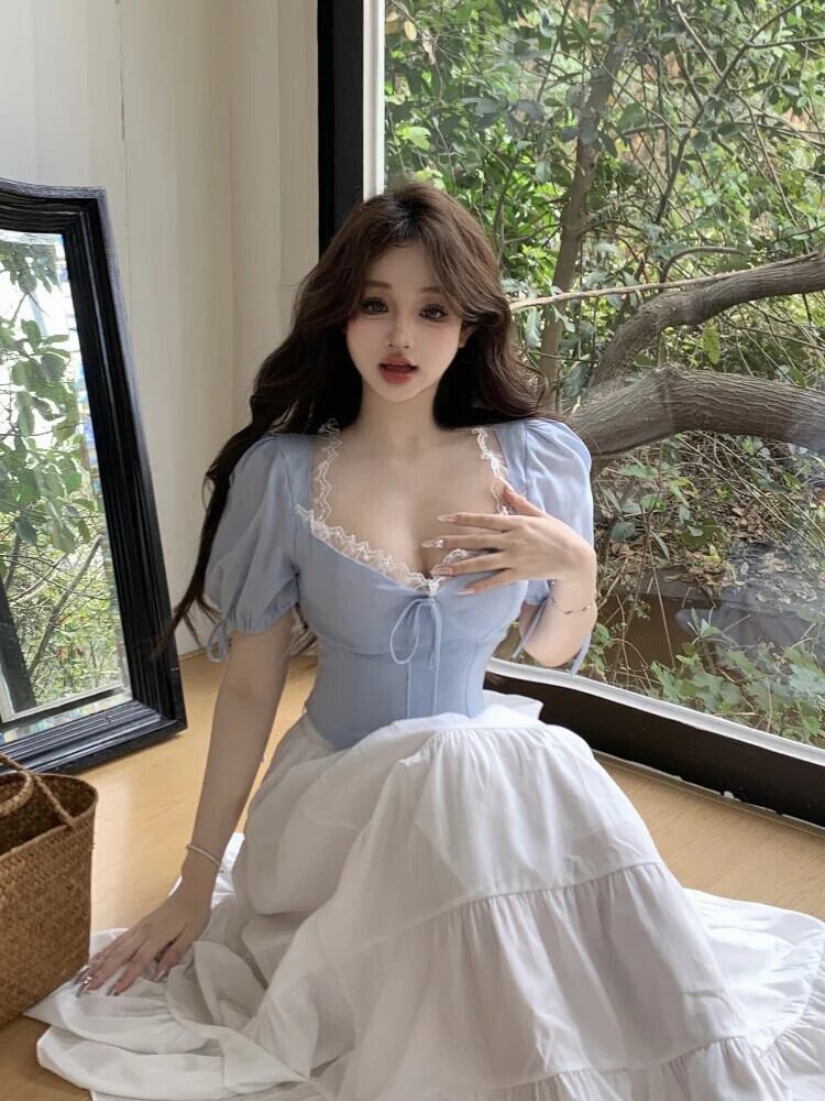 甘いホットガールバブルスリーブ純粋セクシーレース Tシャツ春/夏レース弓半袖トップ リボン 大人ガーリー スウィート キュート カジュアル スプリング 春物 サマー 夏物 ピュア