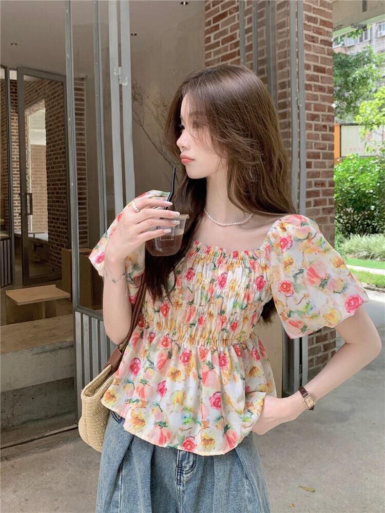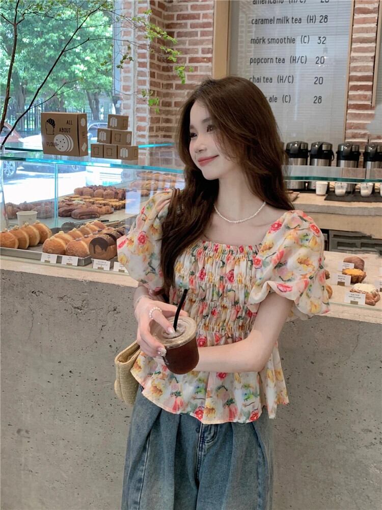 フレンチスイートホットガール花柄シフォンシャツ夏レトロ半袖スクエアカラートップ 大人ガーリー スウィート キュート カジュアル サマー 夏物 スクウェア
