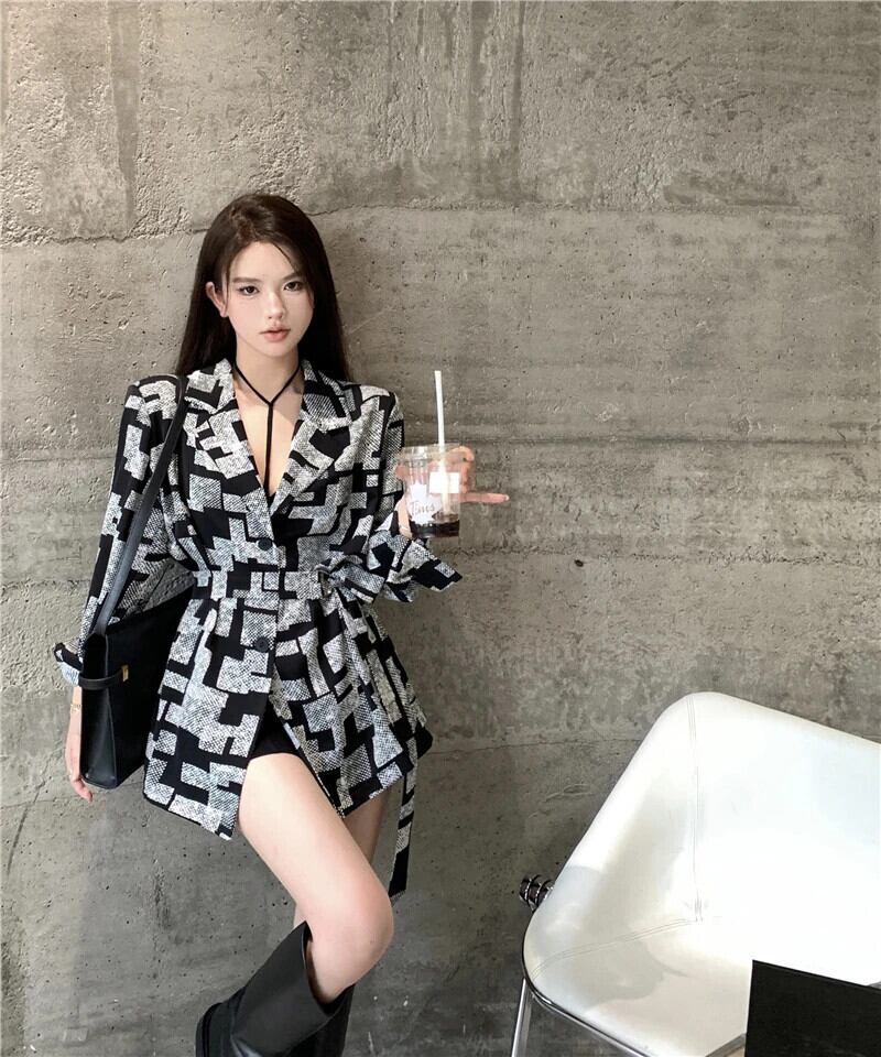 甘いホットガール幾何学プリントジャケット春夏ターンダウン襟ルーズフィットレースアップコート 大人ガーリー スウィート キュート カジュアル スプリング 春物 サマー 夏物