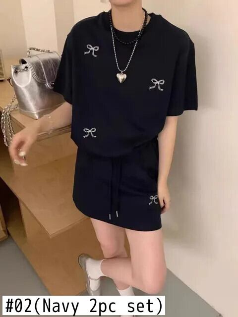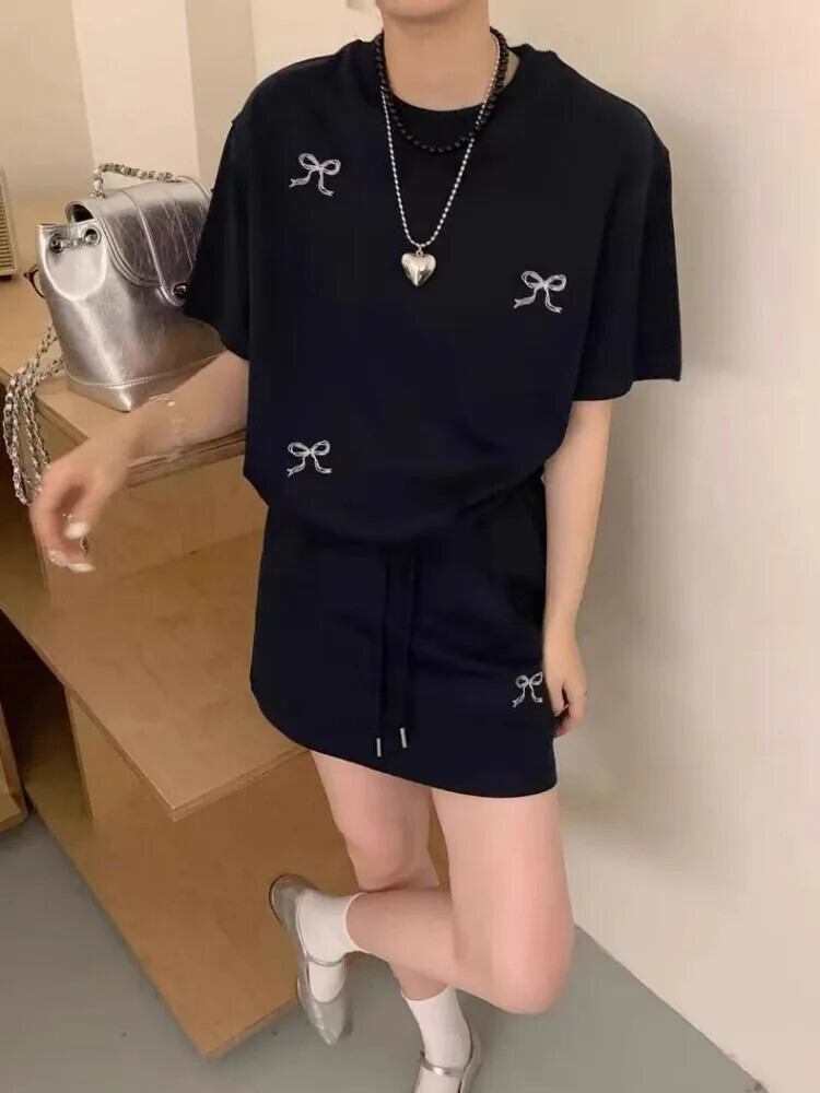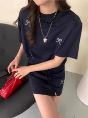 ホットガールスーツ レディース 夏 ルーズ 刺繍 リボン Oネック 半袖 Tシャツ Aライン ショートスカート 2点セット レッド サマー 夏物