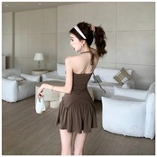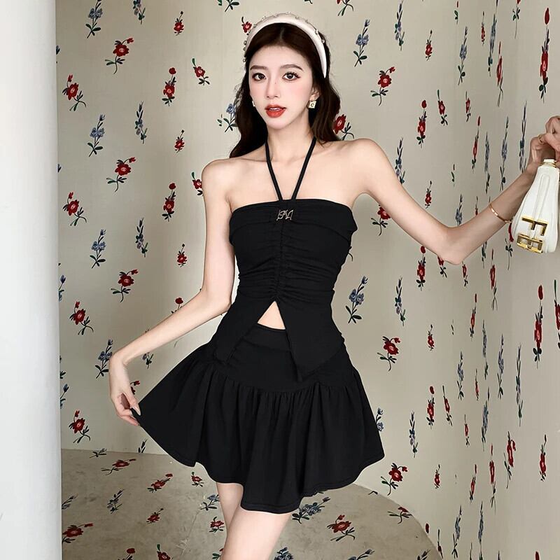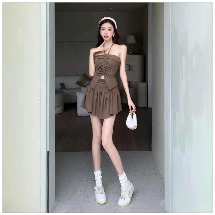 甘いホットガールスーツ夏ホルターネック巾着トップ不規則 A ラインミニスカート 2 点セット 大人ガーリー スウィート キュート カジュアル サマー 夏物 Aライン