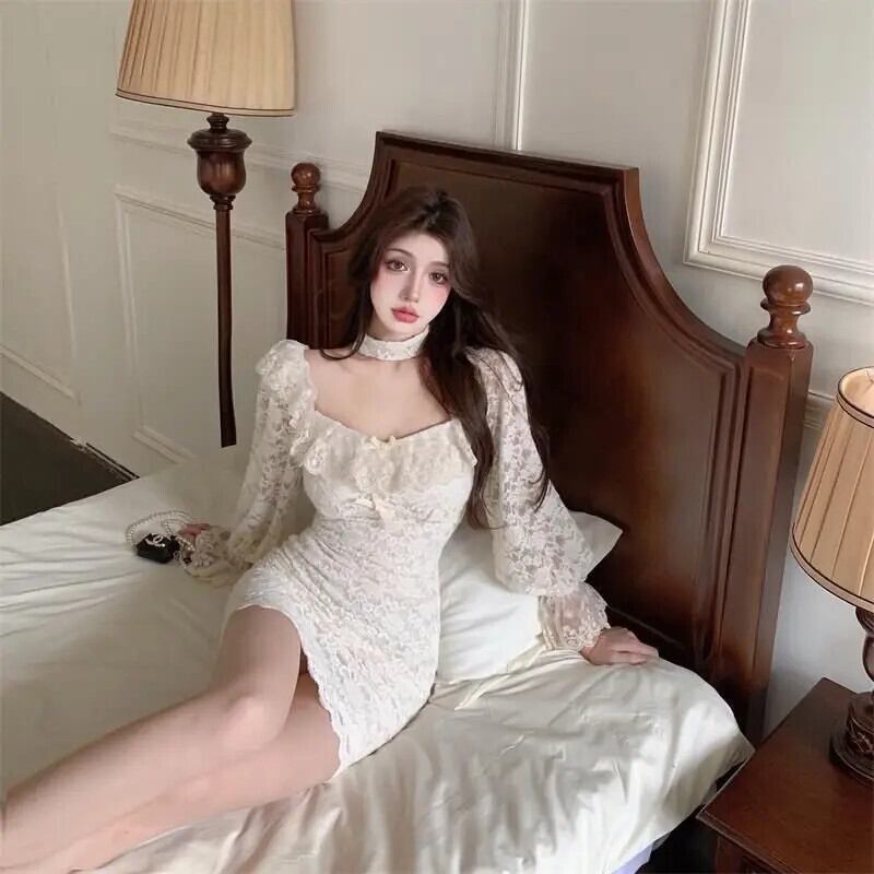 Puresexy ホットガールスクエアカラーレースドレス春フレアスリーブホルターネックスリムフィットショートドレス スプリング 春物 スクウェア