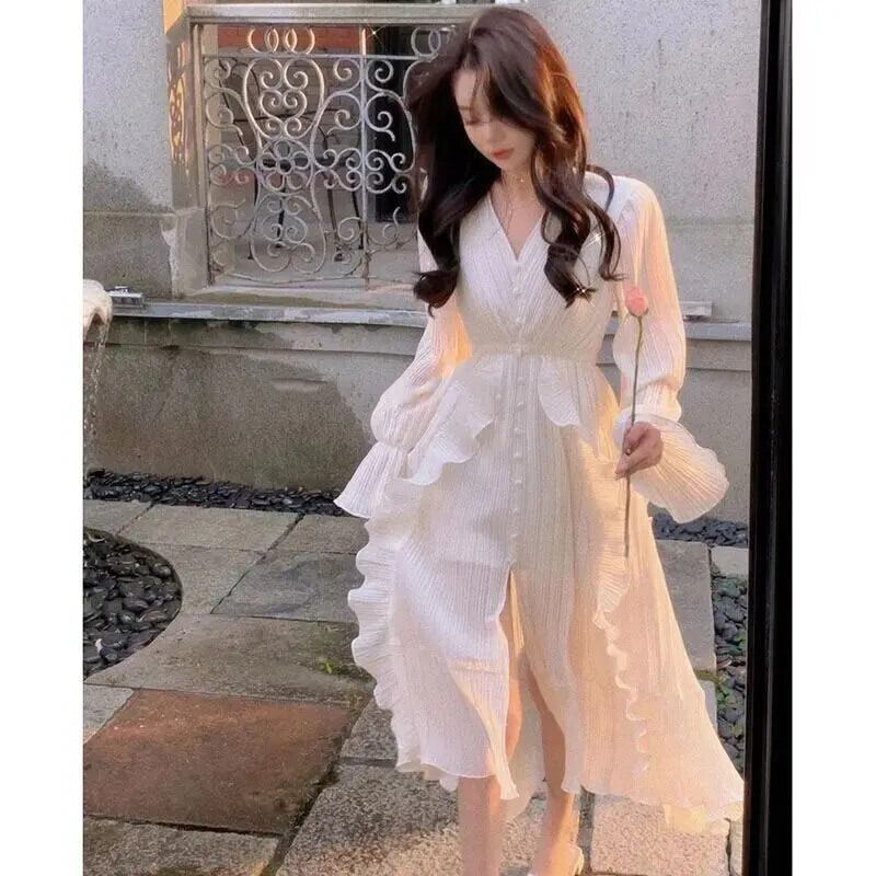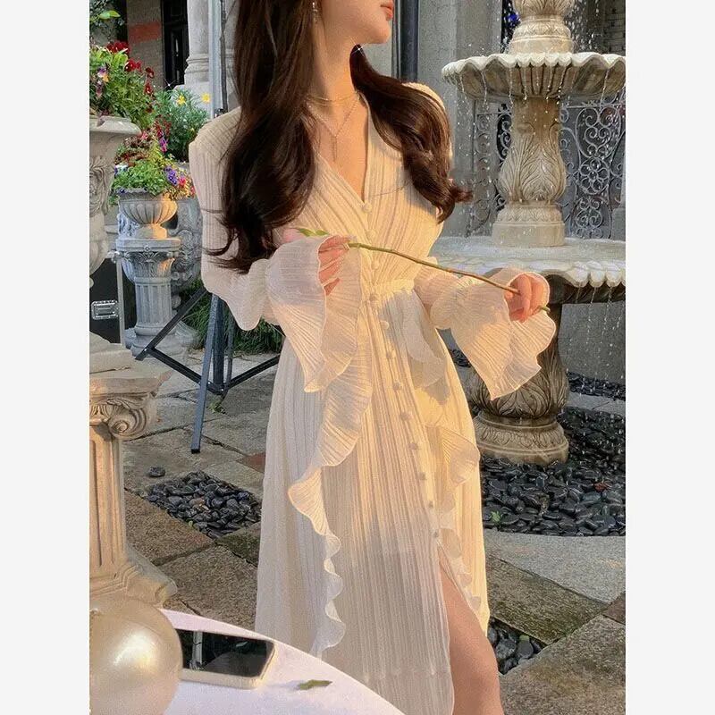 フレンチスイートホットガールドレス春フレアスリーブフリルVネックスリムフィットロングドレス ラッフル 大人ガーリー スウィート キュート カジュアル スプリング 春物