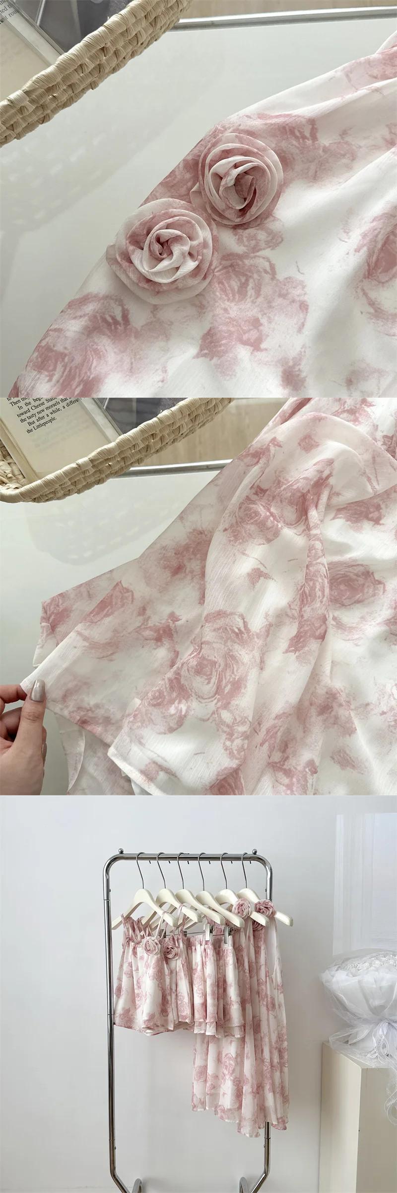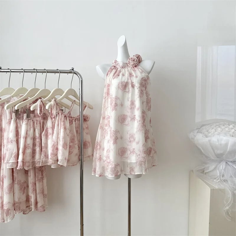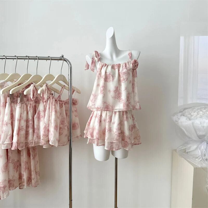 甘いホットガールスーツ春夏インクプリントフラワーホルタートップ A ラインミニスカート 2 点セット 大人ガーリー スウィート キュート カジュアル スプリング 春物 サマー 夏物 Aライン フラワーデザイン