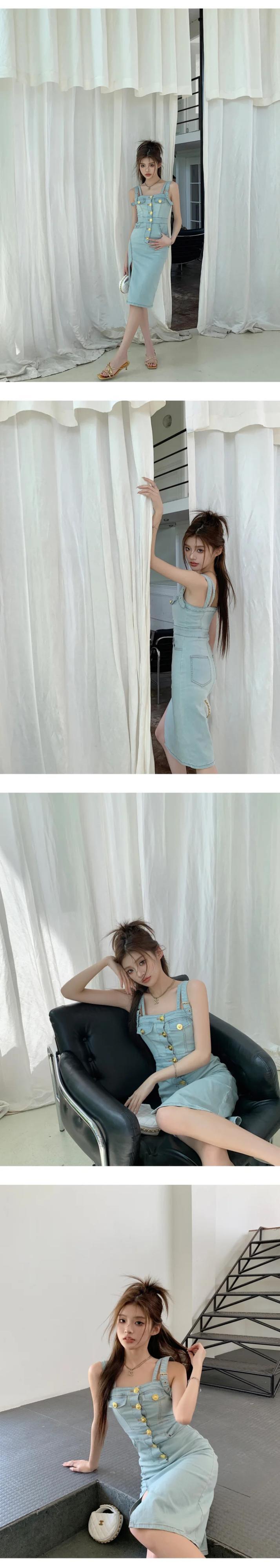 甘いホットガールサイドスリットデニムストラップドレス春夏ウエストスリムフィット純粋セクシーラップ尻ドレス 大人ガーリー スウィート キュート カジュアル スプリング 春物 サマー 夏物 ピュア