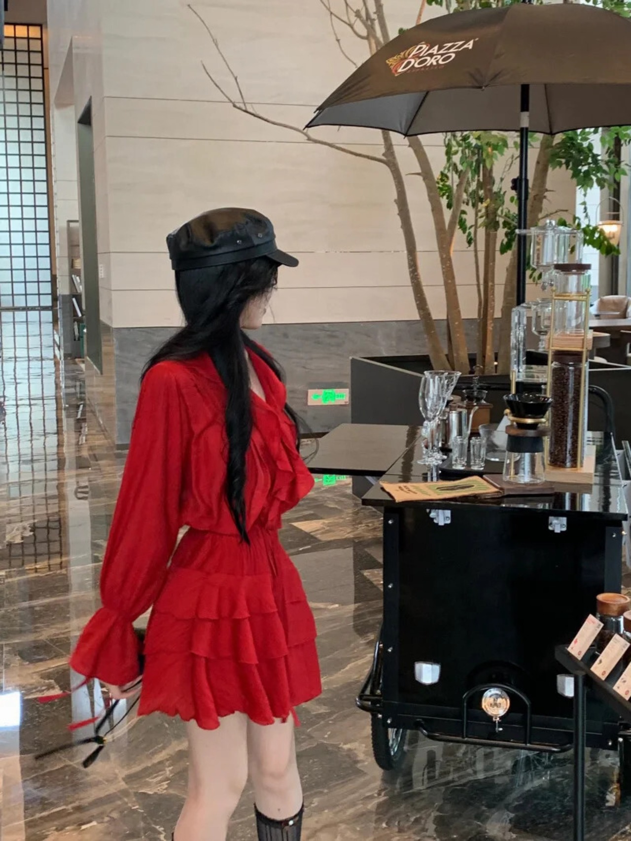 甘いホットガールスーツ春フリル V ネックレースアップシャツウエストケーキスカート 2 点セット 大人ガーリー スウィート キュート カジュアル スプリング 春物 Vネック