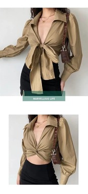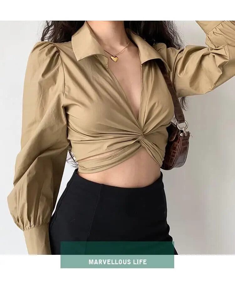 アメリカンホットガールセクシークロス V ネックレースアップシャツウエストランタンスリーブショートターンダウン襟トップ Vネック