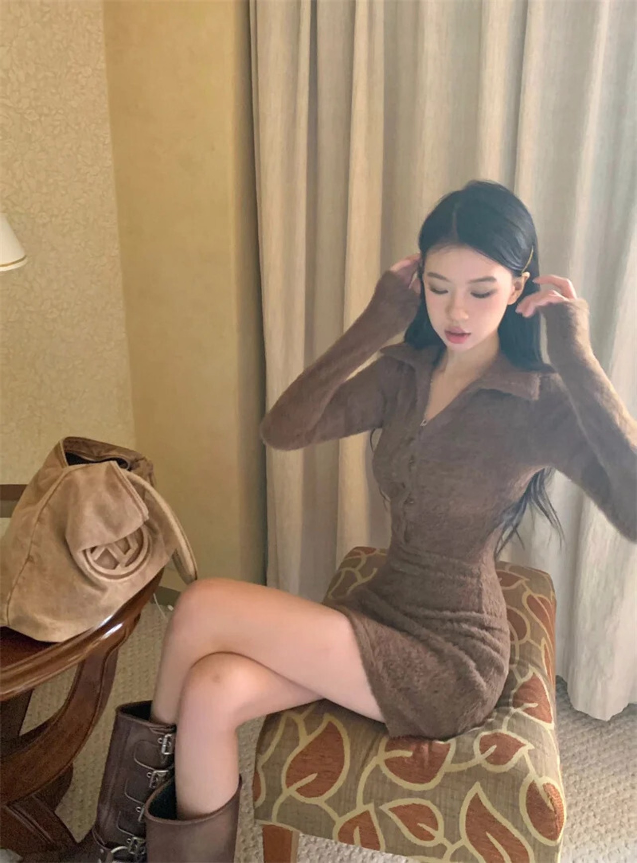 甘いホットガールレトロソリッドカラーラペルニットドレス冬スリムフィット長袖ヒップラップショートドレス ロング 大人ガーリー スウィート キュート カジュアル ウィンター 冬物