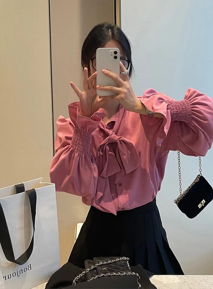 フレンチスイートホットガール通勤ボウシャツ春ルーズレースアップ長袖ピンクシャツ ロング リボン 大人ガーリー スウィート キュート カジュアル スプリング 春物