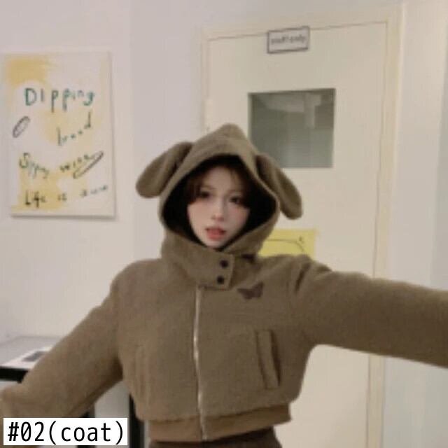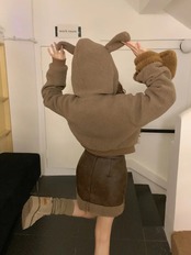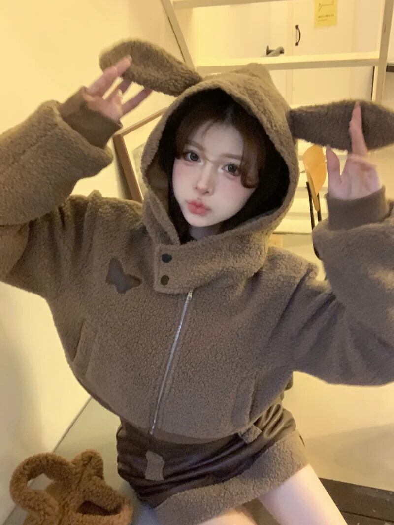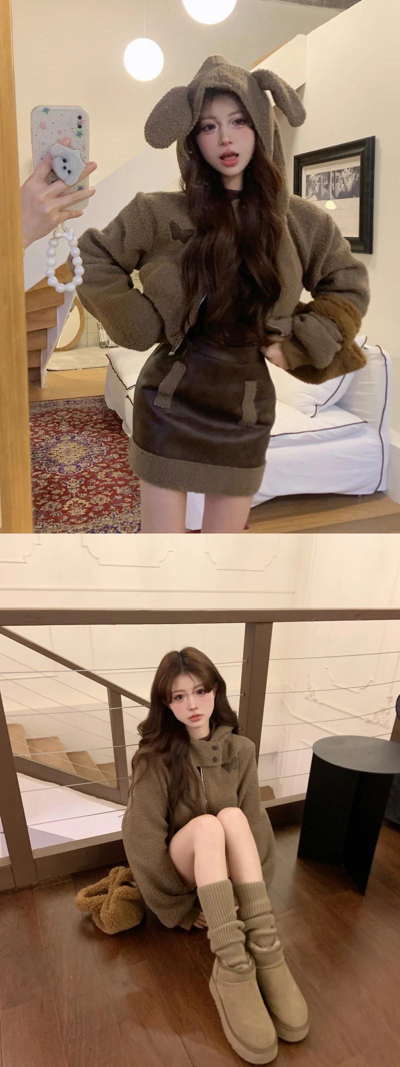 甘いホットガールウサギ耳スーツ秋フード付きコットンジャケットウエストレザースカートツーピースセット 大人ガーリー スウィート キュート カジュアル オータム 秋物