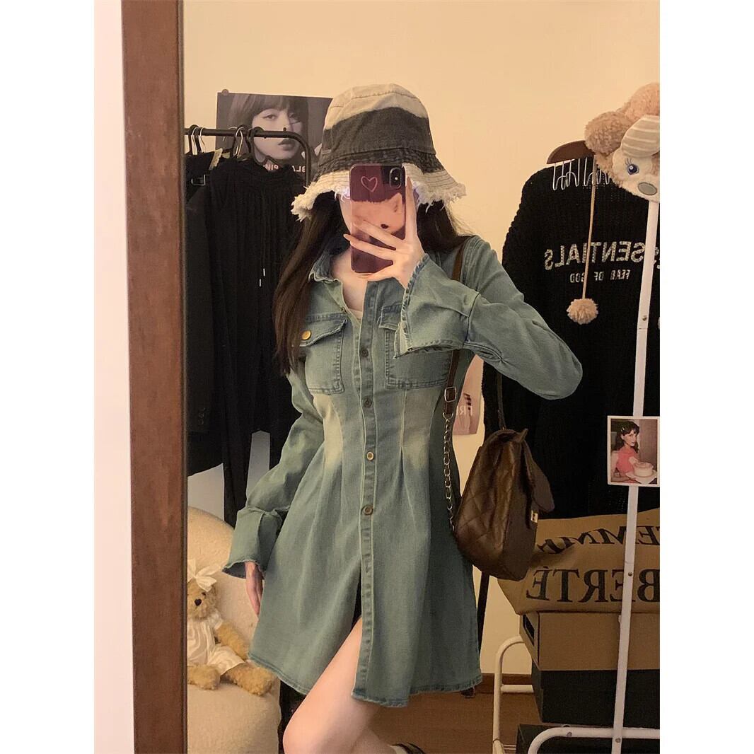 ホットガールレトロスタイルスーツ春と秋長袖デニムシャツウエストショートパンツツーピースセット ロング スプリング 春物 オータム 秋物