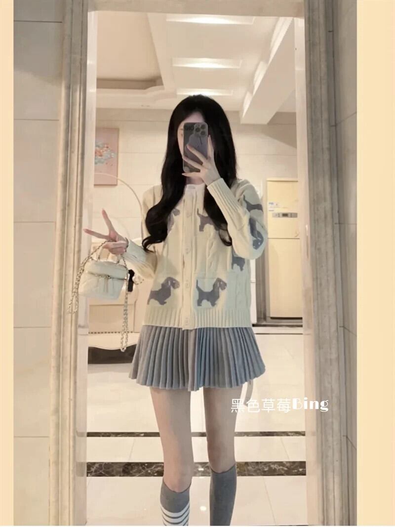 純粋セクシースウィートガールスーツ春 O ネックニットカーディガンウエスト A ラインスカート 2 点セット 大人ガーリー キュート カジュアル スプリング 春物 Oネック Aライン