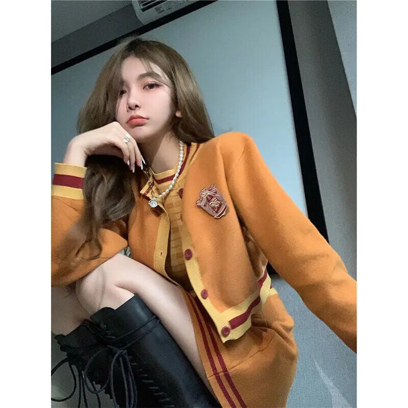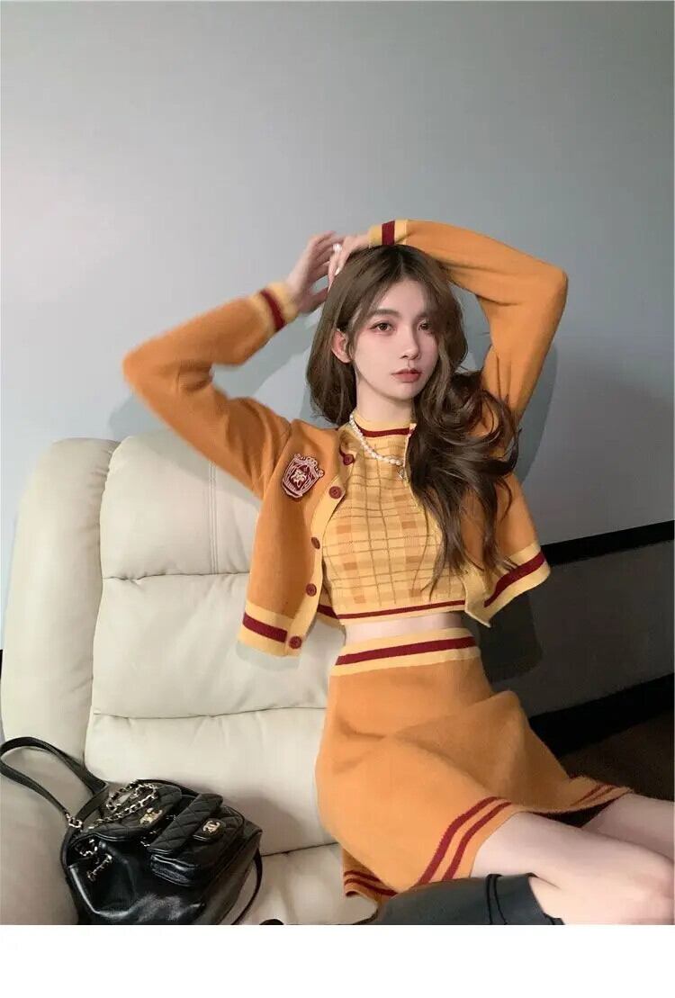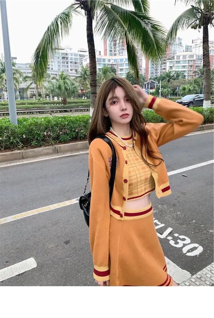 甘いホットガールニットスーツ秋長袖カーディガンチェック柄タンクトップ A ラインミニスカート 2 点セット ロング 大人ガーリー スウィート キュート カジュアル オータム 秋物 Aライン