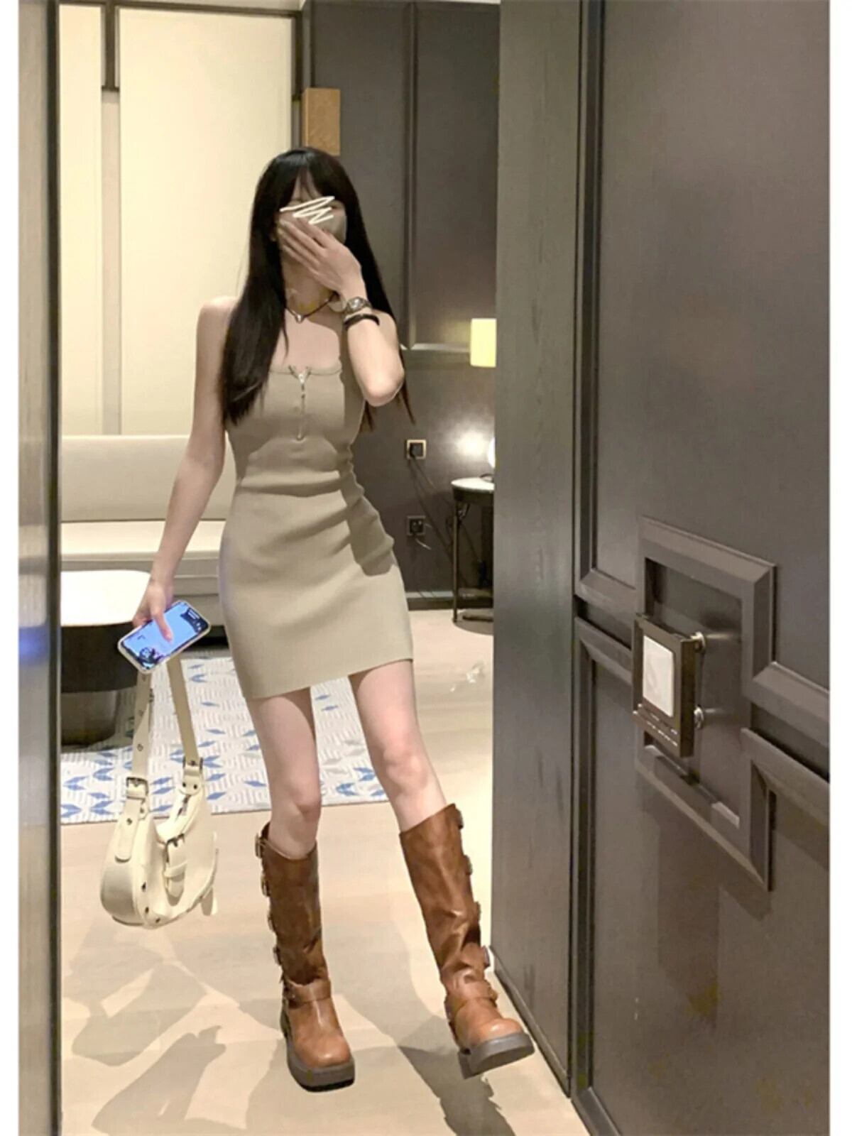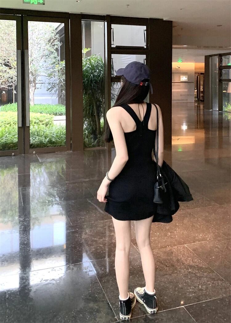 甘いホットガールジッパー付き黒ストラップドレス夏スリムフィット尻ラップスクエアカラーショートドレス レッド ブラック 大人ガーリー スウィート キュート カジュアル サマー 夏物 スクウェア