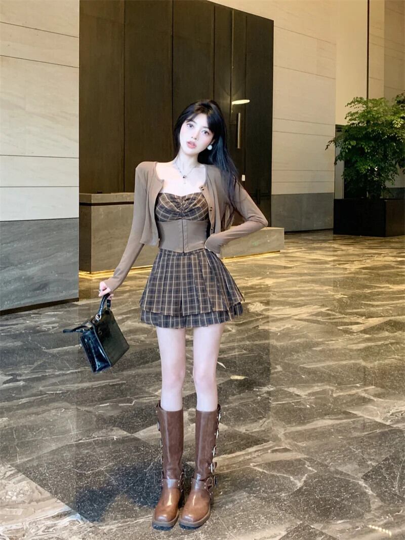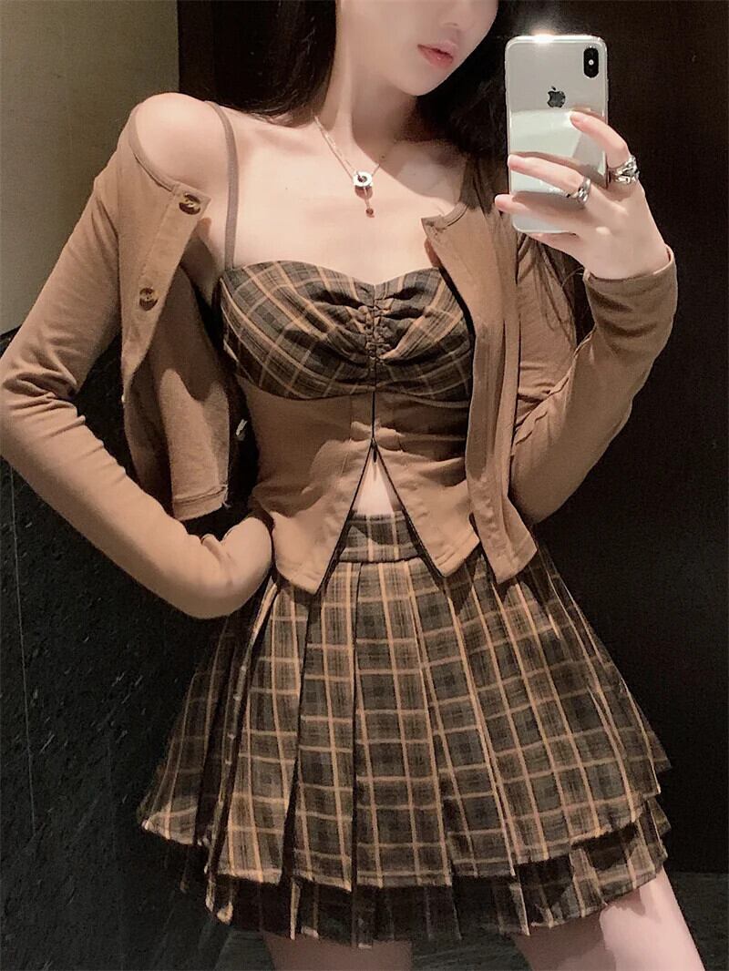 甘いホットガールスーツ春パッチワークチェック柄キャミソール長袖カーディガンプリーツスカート 3 点セット ロング 大人ガーリー スウィート キュート カジュアル スプリング 春物
