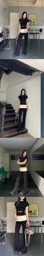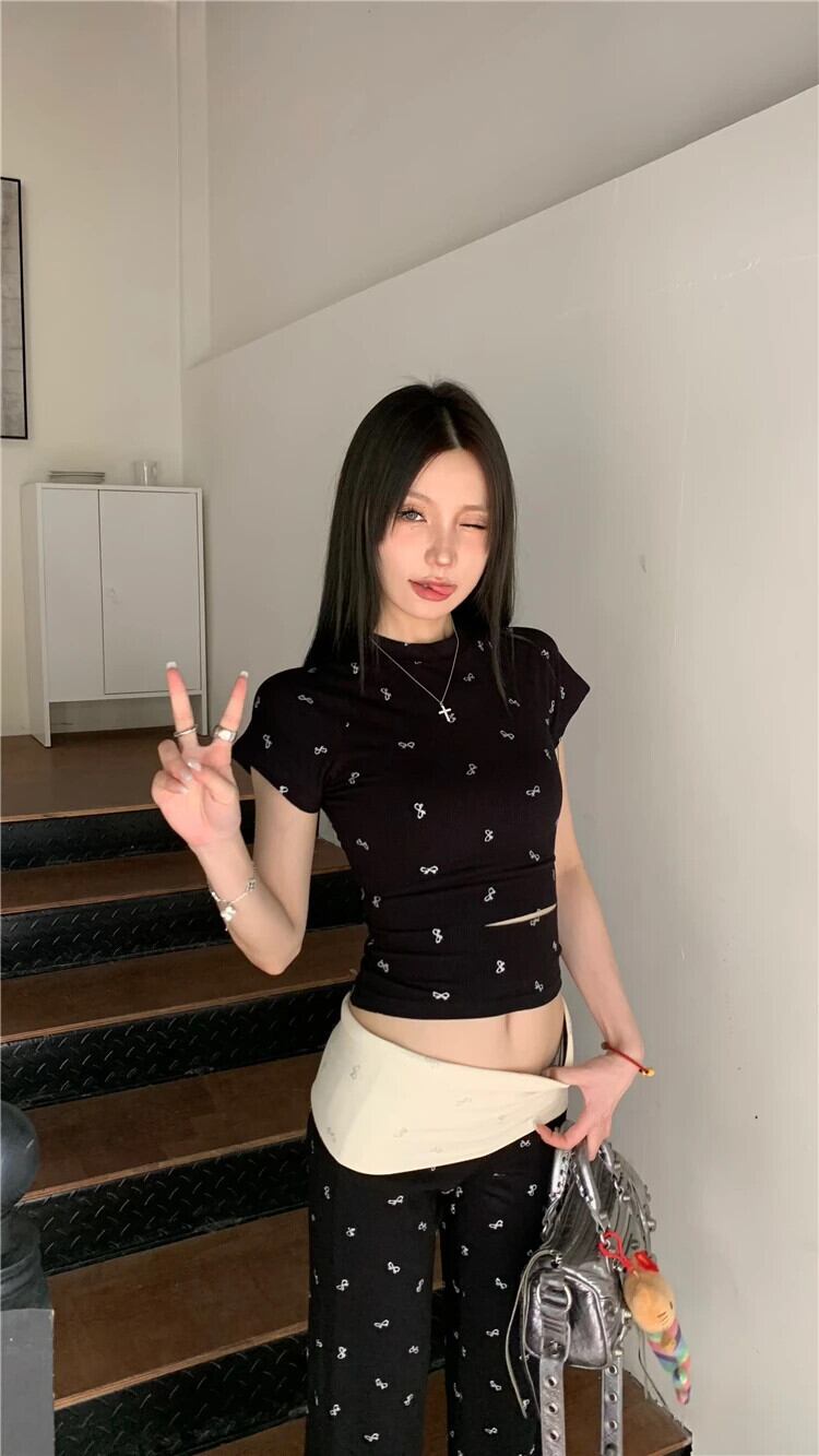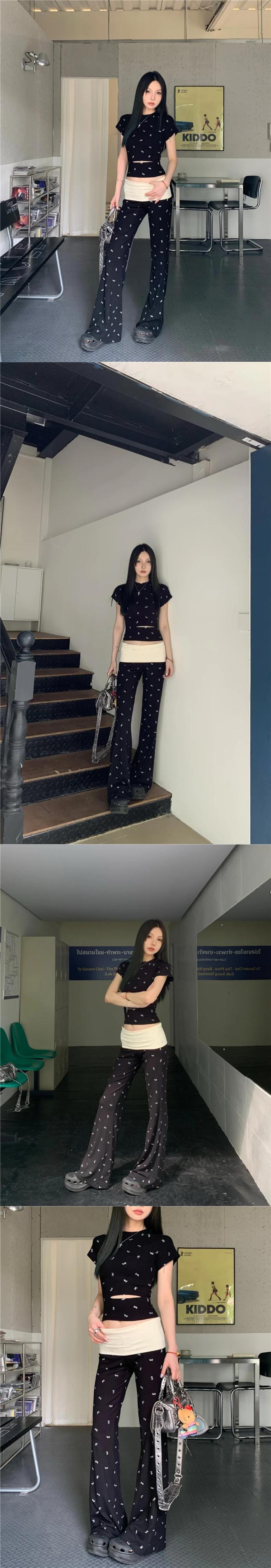 甘いホットガールスーツ夏半袖 Tシャツコントラストリボンパンツ 2 点セット 大人ガーリー スウィート キュート カジュアル サマー 夏物