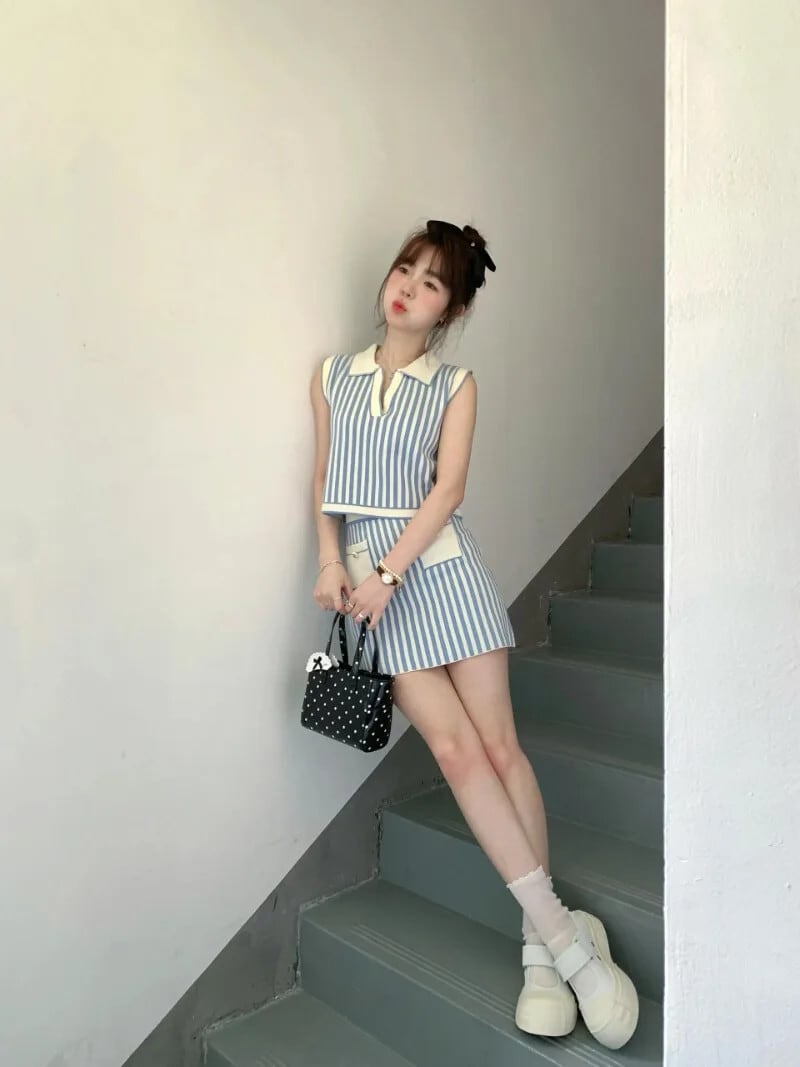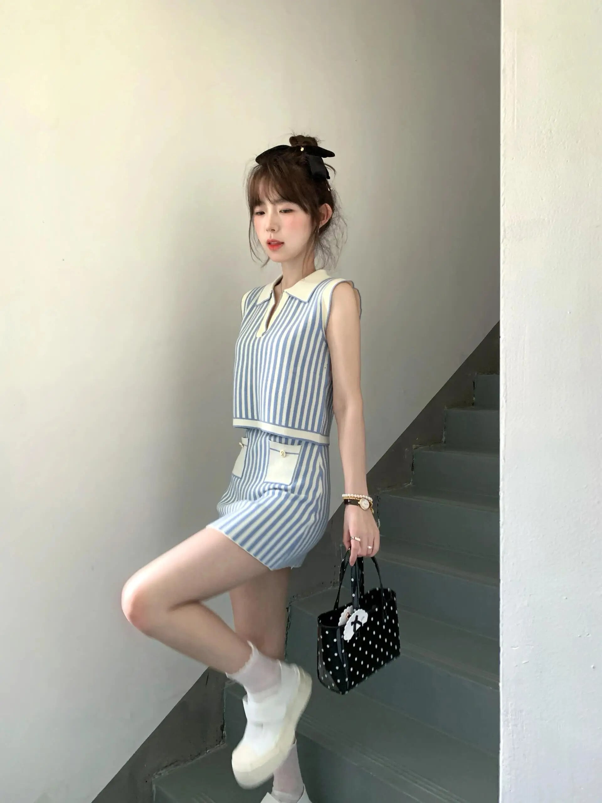 スイートホットガールスーツ春夏青と白ストライプニットノースリーブベストウエストミニスカート 2 点セット ホワイト ブルー 大人ガーリー スウィート キュート カジュアル スプリング 春物 サマー 夏物