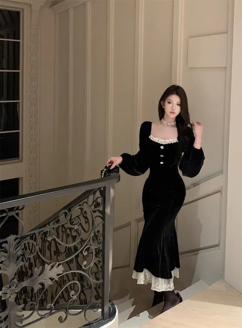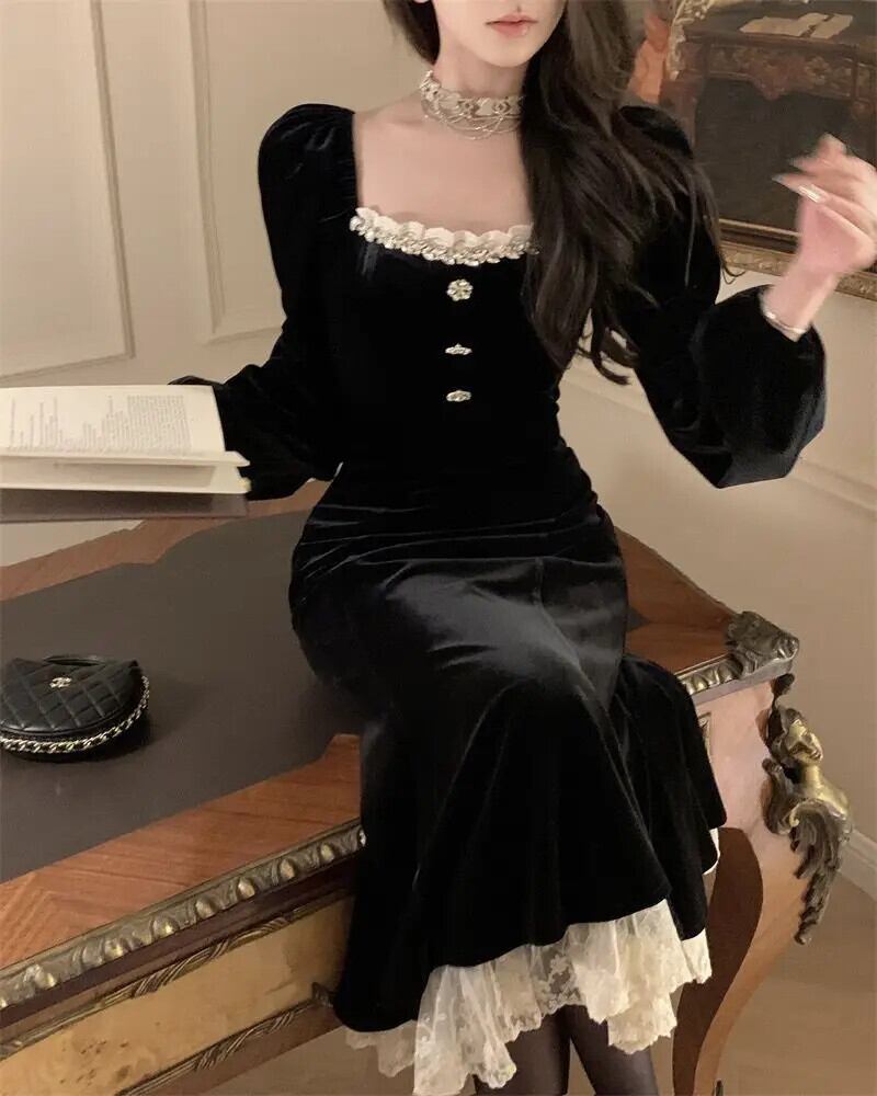 甘いホットガールレース長袖スクエアカラードレス秋と冬スリムフィットマーメイドブラックベルベット A ラインドレス ロング 大人ガーリー スウィート キュート カジュアル オータム 秋物 ウィンター 冬物 Aライン スクウェア
