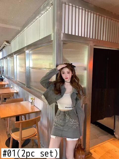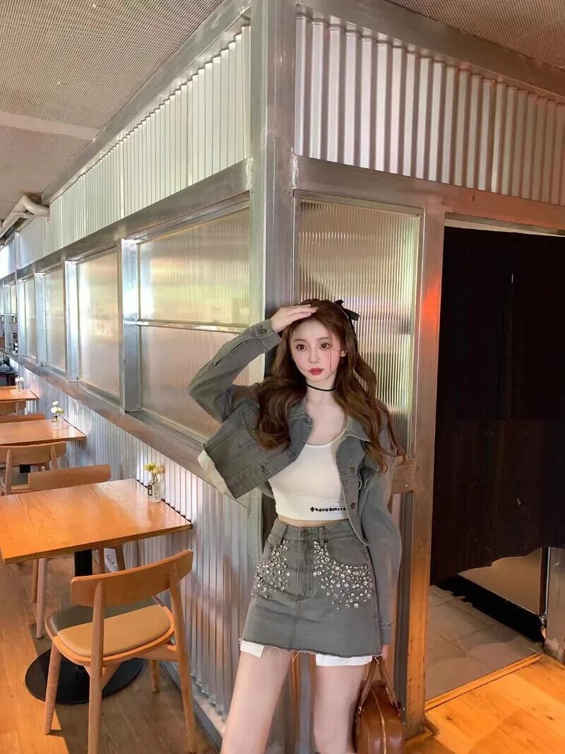 アメリカンホットガールレトロデニムスーツ春ショートジャケットウエストダイヤモンドスカートツーピースセット スプリング 春物