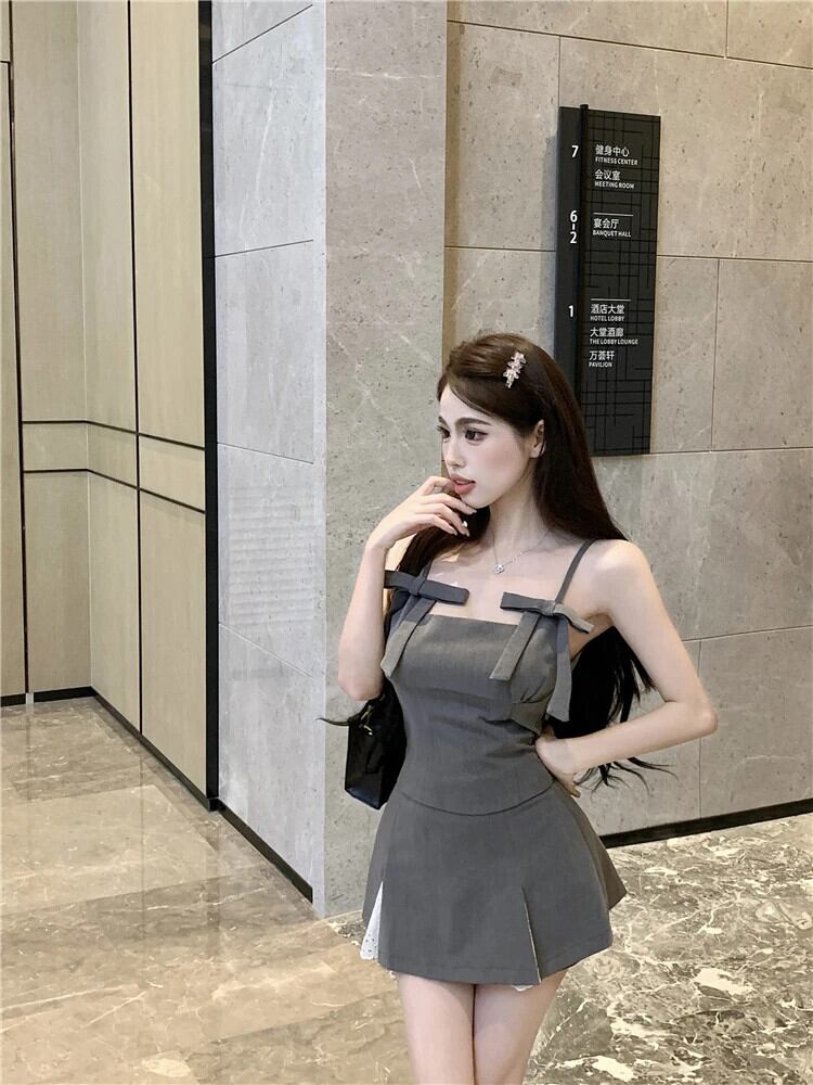 甘いホットガールスーツ夏弓スリムストラップベストスプリットレースパッチワークミニスカートツーピースセット リボン 大人ガーリー スウィート キュート カジュアル サマー 夏物