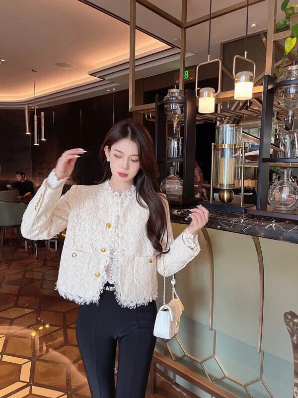 フレンチスイートホットガールレースフラワーショートコート春Oネック長袖シングルブレストスリムコート ロング 大人ガーリー スウィート キュート カジュアル スプリング 春物 フラワーデザイン