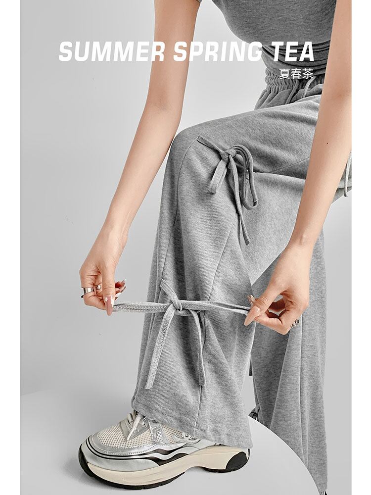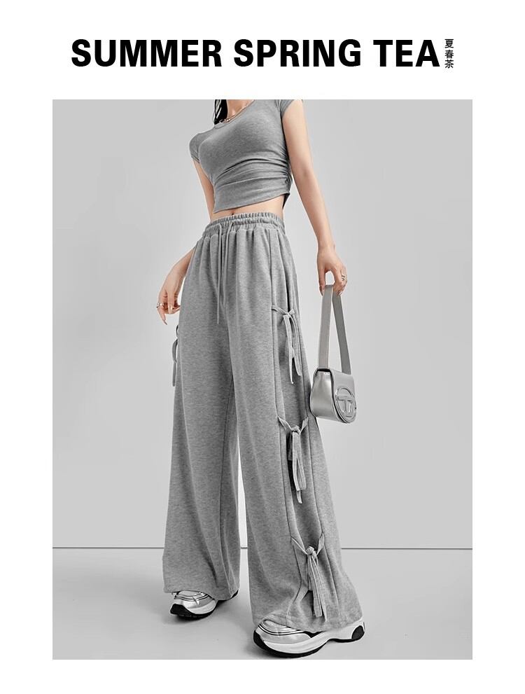 甘いホットガールワイドレッグパンツ春/夏弾性ウエスト蝶ネクタイスポーツロングパンツ リボン エラスティック 伸縮 大人ガーリー スウィート キュート カジュアル スプリング 春物 サマー 夏物 ワイドパンツ