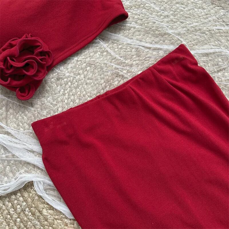 スイートホットガールスーツ春夏ノースリーブ赤い花ストラップトップセクシーお尻ラップスカート 2 点セット レッド 大人ガーリー スウィート キュート カジュアル スプリング 春物 サマー 夏物 フラワーデザイン